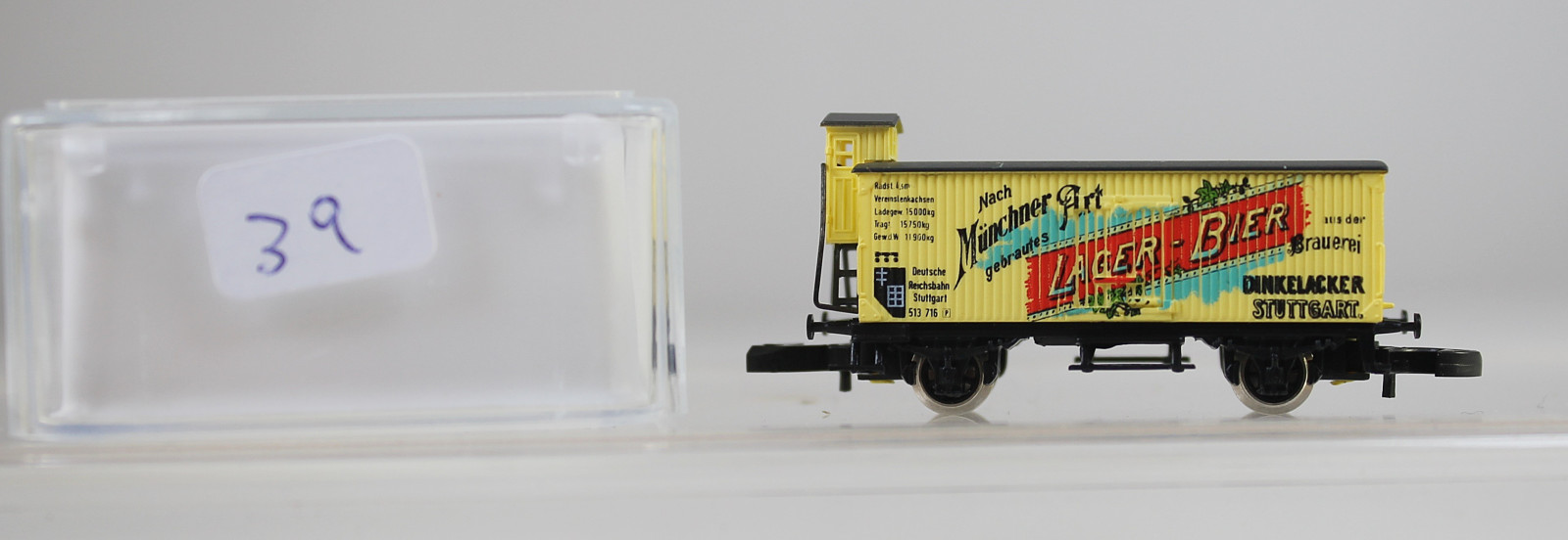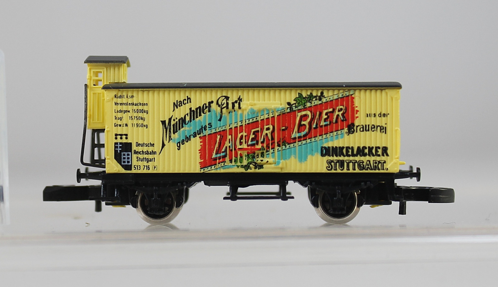 Vorbild: Zweiachsiger gedeckter Güterwagen mit Bremserhaus in beige mit der Aufschrift "Nach Münchner Art gebrautes LAGER-BIER aus der Brauerei DINKELACKER STUTTGART". Sondermodell