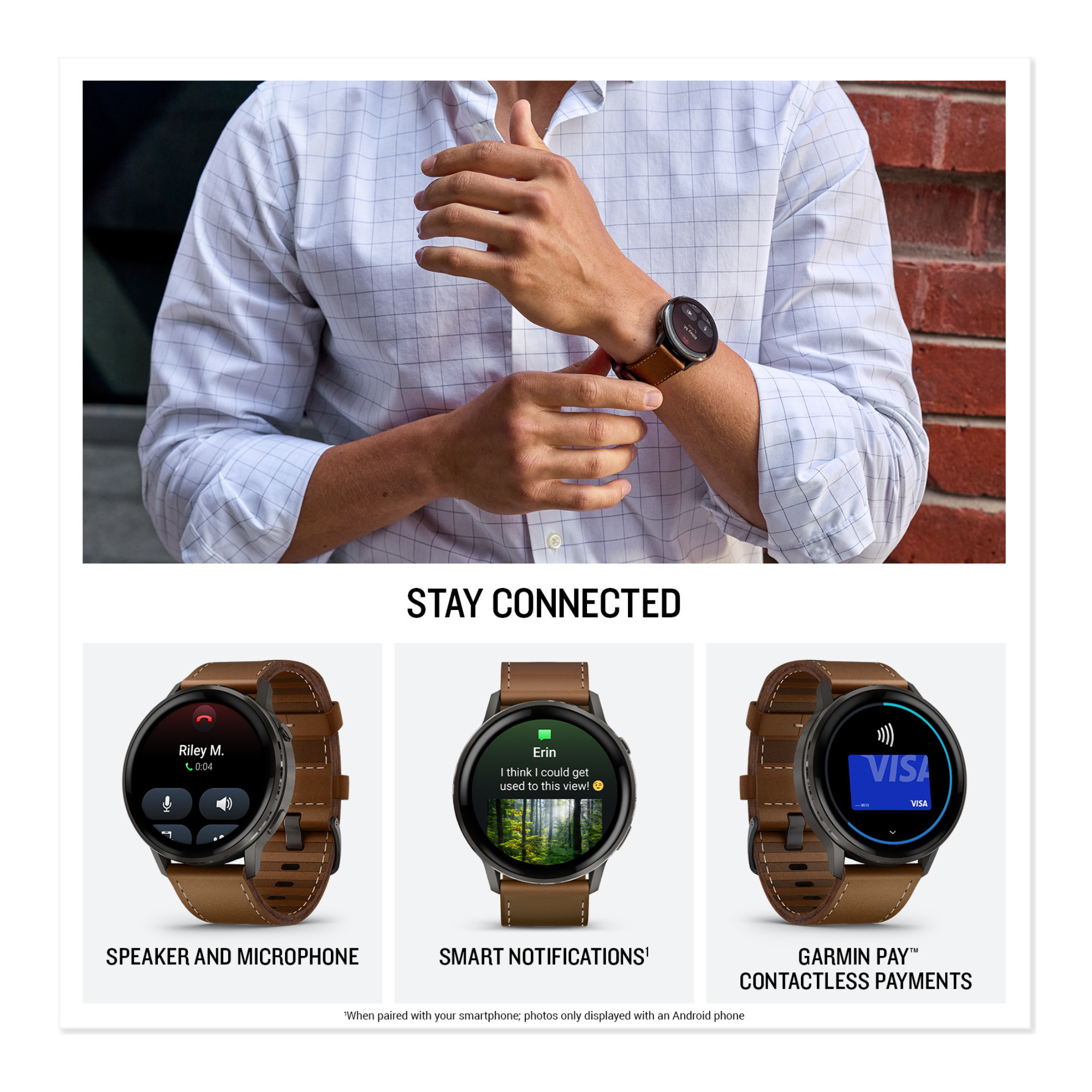 Make and take calls from your wrist when paired with a compatible smartphone. Use your phone’s voice assistant to reply to texts, or respond directly from the watch (voice/text reply available on Android).