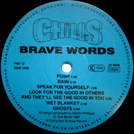 Brave Words was the debut studio album by New Zealand band the Chills, released in 1987. It was produced by Mayo Thompson. German pressing released with a lyric inner sleeve. Alternate blue label printing. The record has been played regularly. Some surface noise and mild scratches are audible. Nevertheless worth obtaining as it still offers a satisfying listening experience.