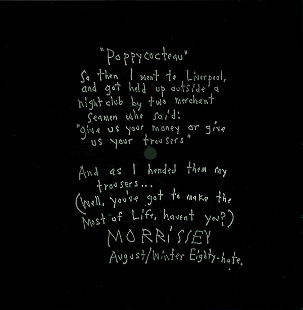 FLEXI-DISC Issued as a square-shaped disc with the Morrissey-penned poem Poppycocteau printed on the backside. No magazine