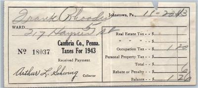 Cambria County Pennsylvania Tax Receipt 1943