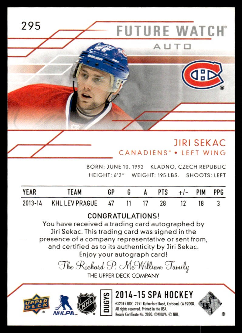 | 2014-15 SP Authentic Future Watch Auto Jiri Sekac Rookie Auto 479/999 Montreal |