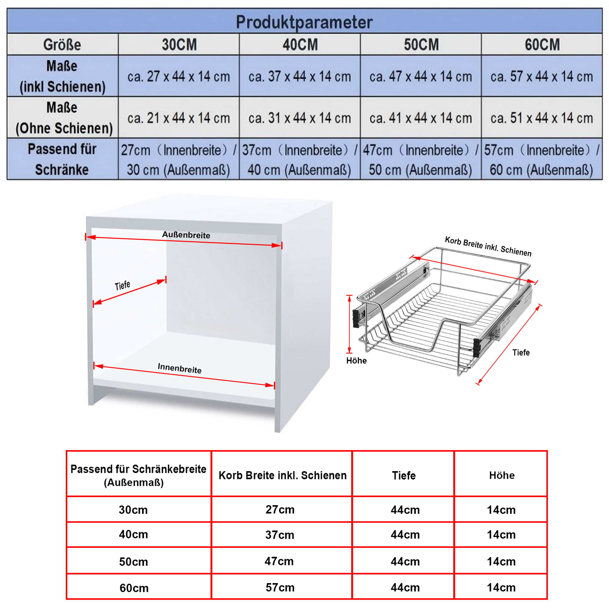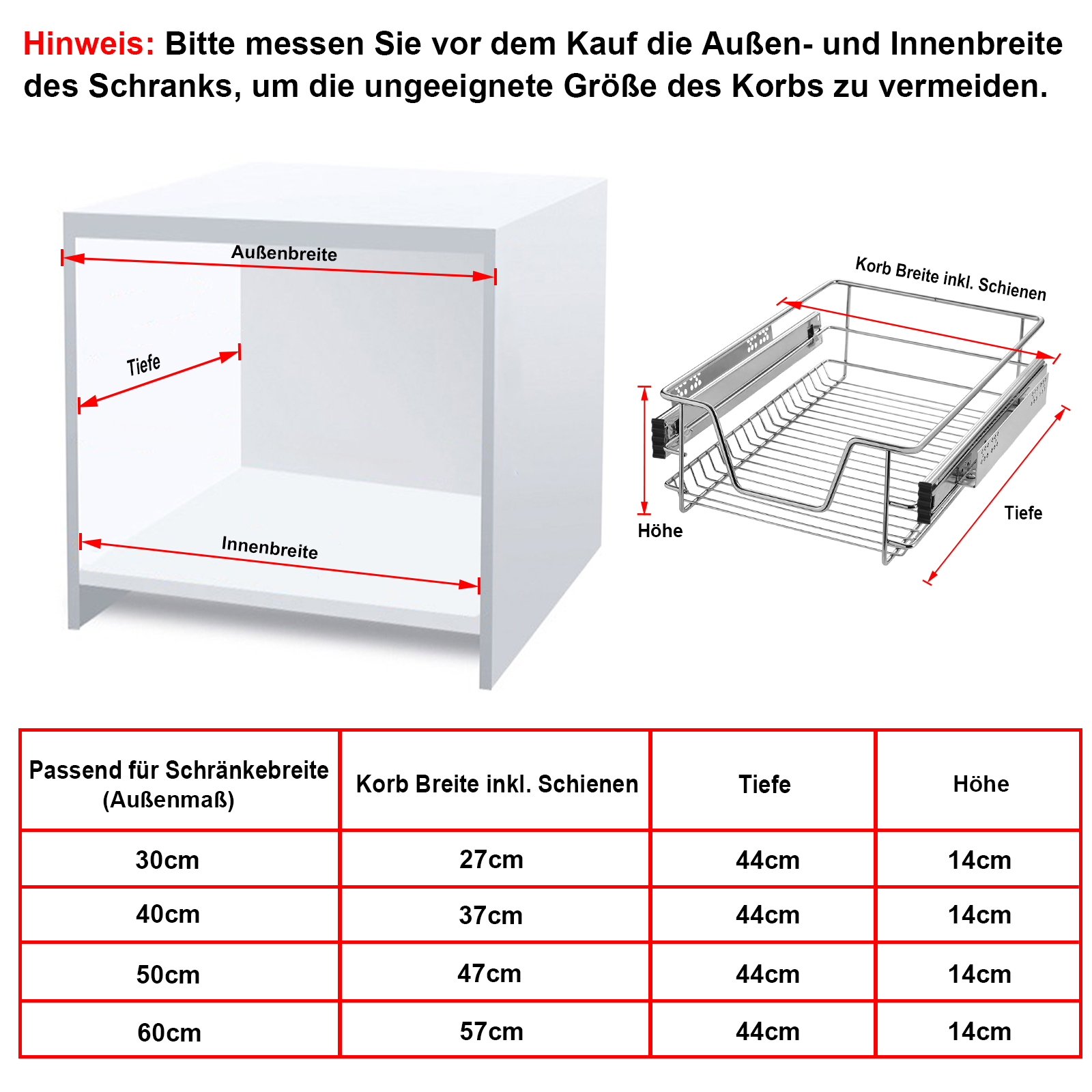 Hinweis: Bitte messen Sie vor dem Kauf die Außen- und Innenbreite des Schranks, um die ungeeignete Größe des Korbs zu vermeiden.