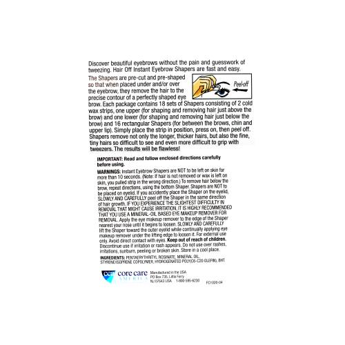Quick, easy, mistake-proof - that's Hair Off. Active Ingredients: Pentaerythrityl Rosinate; Mineral Oil; Styrene/Isoprene/Copolymer; Hydrogenated C6-C20 Polyolefin; BHT Uses: Discover beautiful eyebrows without the pain and guesswork of tweezing. Hair Off Instant Eyebrow Shapers are fast, easy and mistake-proof. 18 sets of pre-cut shapers.