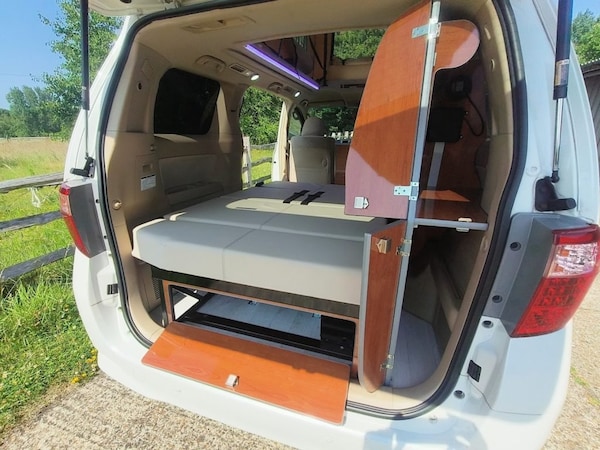 This freshly imported Japanese Toyota Alphard has covered just 79,758 miles and is finished in a striking metallic white, giving it a sleek and modern appearance that stands out wherever it goes. The interior has been professionally converted to a high standard, featuring a rock and roll bed with seatbelts and a hydraulic lift system, a poptop roof with integrated lighting and a USB charger, and L shaped kitchen cupboards designed to maximise space. It also includes two tables, one slide out cupboard table and one clip in end table providing excellent versatility for dining or working on the move. The finish and materials used throughout are of very high quality, and the privacy glass offers comfort and discretion while travelling.The electrical setup has been thoughtfully designed for both convenience and off grid capability. It includes a split charger, a heavy duty leisure battery, 12V and 240V power outlets for all your gadgets, and a solar panel mounted on the roof. Multiple USB chargers are positioned throughout the cabin, and the ceiling lighting is complemented by stylish airplane style ambient lighting.Comfort and ease of use are key features of this Alphard, with dual electric sliding doors, steering wheel controls, and ice cold air conditioning for both front and rear passengers. The push button start system and Eco driving mode add to the premium experience. On the outside, the Alphard is equipped with alloy wheels, privacy glass, automatic headlights, a reversing camera, and parking sensors for effortless manoeuvring. It is also fully ULEZ compliant, making it ideal for city driving.This Alphard perfectly blends luxury, practicality, and adventure, offering exceptional comfort whether you are commuting, touring, or camping. Please contact us to arrange a viewing at our Brighton showroom.All our campervans come with a 12-month Autoguard warranty and a 12-month campervan conversion warranty from Ideal Campervan.