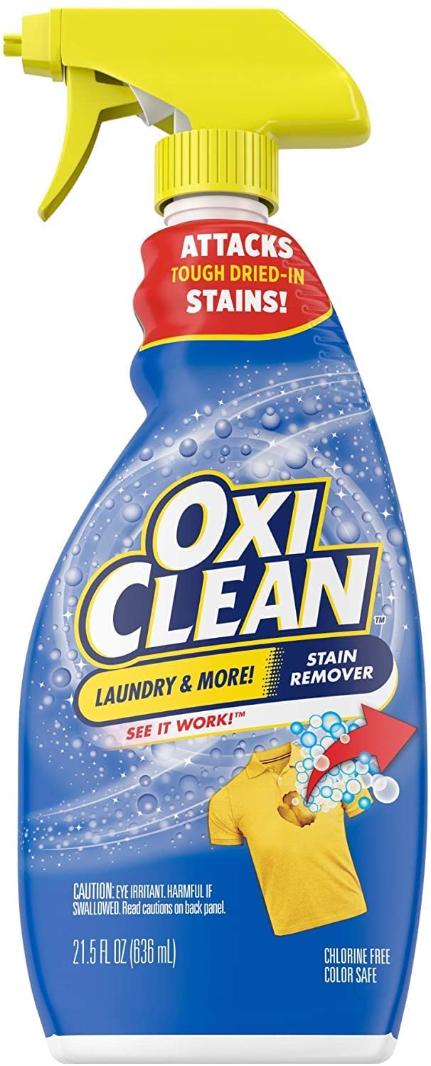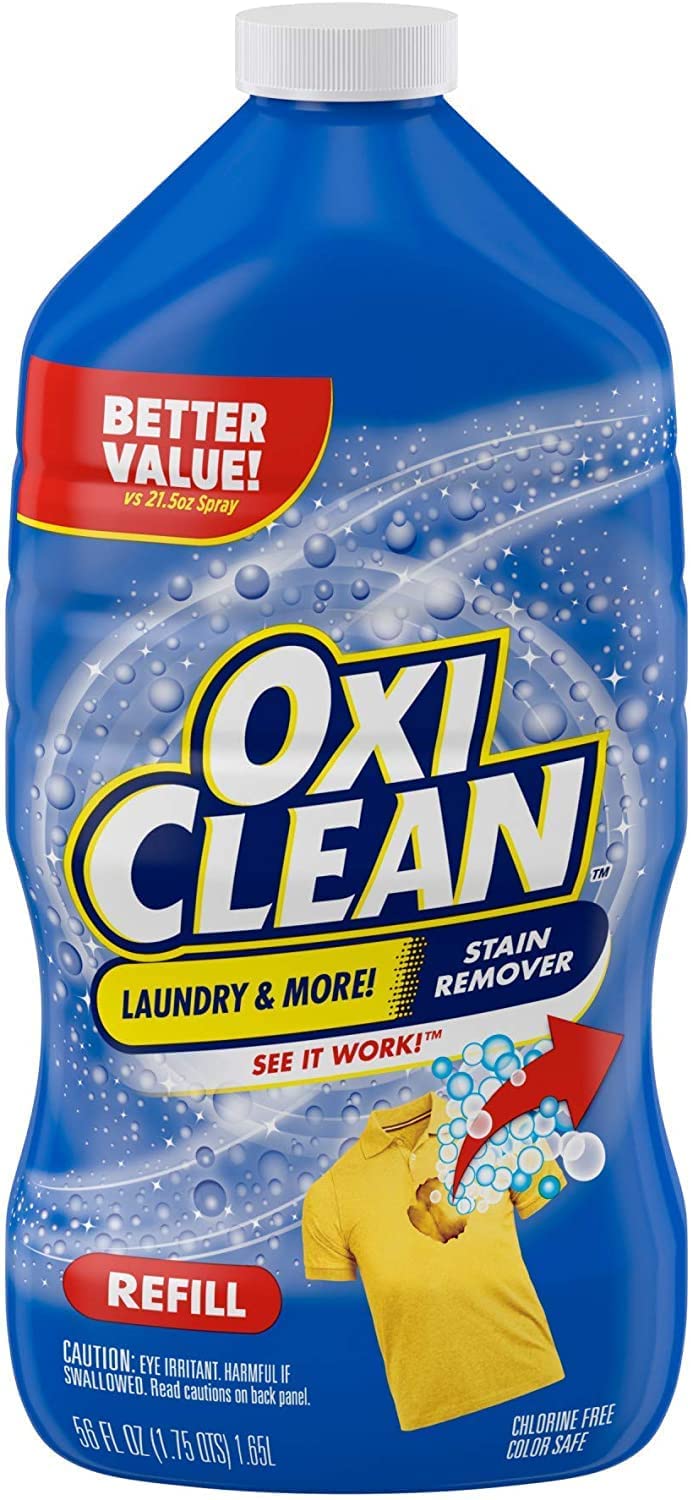 For stains on laundry, carpet and beyond! Even removes set-in stains! Bring on the stains! OxiClean Active Stain Remover gets out your toughest stains and odors such as wine, blood, dirt, tomato, pet stains, grass and even some set-in-stains. This unique formula starts to work before your eyes. It is chlorine-free and color-safe. It contains hydrogen peroxide. OxiClean Laundry Stain Remover is a powerful, fast-acting and convenient laundry pre-treater. Catch stains before they get into the wash, and you can get them out the first time—saving your clothes and your peace of mind. Harness the power of oxygen with this super-convenient, fast-acting spray stain remover! It clings to fabric fibers, diving deep into problem laundry stains and odors with a unique formula that begins to remove stains on contact—right before your eyes. Plus, it's chlorine-free and color safe. Never run out of OxiClean Laundry Stain Remover Spray with this OxiClean Laudry Stain Remover Bundle Pack. Includes one OxiClean Laundry Stain Remover 21.5 Ounce spray bottle and a 56oz. bottle of OxiClean Laundry Stain Remover Refill.
