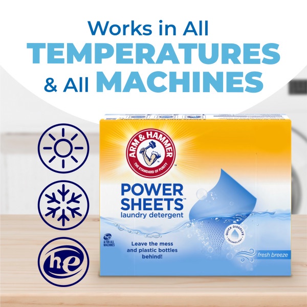 For a powerful, deep clean without plastic bottle waste or mess, use ARM & HAMMER Power Sheets Laundry Detergent, Fresh Breeze, 35 count, 70 loads. Are you concerned about your impact on the environment? If you are, ARM & HAMMER has designed this product to eliminate plastic bottle waste. Our new liquidless laundry detergent sheets use lightweight, recyclable boxes so no more lugging and pouring heavy, drippy bottles. This innovative laundry detergent sheet is ideal for travel—light, portable, convenient for laundromat or suitcase. Our no-bleach, concentrated laundry detergent sheets are tough on odors, dirt, and stains and feature a fresh Breeze scent. These HE detergent sheets handle tough loads of dark or white clothing in all wash temperatures, even cold water. Thanks to Quick Dissolve Technology, our high efficiency laundry detergent sheets dissolve completely in water. Use 1 sheet for medium loads or 2 sheets for large loads. Made with the same type of powerful cleaning ingredients as our liquid detergent for the trusted clean you expect from ARM & HAMMER Laundry. Bullet Feature 1* One 35 count box of ARM & HAMMER Power Sheets Laundry Detergent in Fresh Breeze scent cleans 35 medium loads (up to 70 small loads) when used as directed; this concentrated laundry detergent delivers a powerful, deep clean on dark clothing or white clothing with no bleach Bullet Feature 2* Convenient laundry detergent sheets mean no drips, no spills, and no plastic bottle waste; they use small, light, recyclable packs to avoid lugging heavy bottles up and down stairs to basement laundry Bullet Feature 3* Ultra concentrated to tackle tough stains with a fresh Breeze scent; these dissolvable detergent laundry sheets are made with the same type of powerful ingredients as our liquid laundry detergent for a trusted ARM & HAMMER Laundry clean Bullet Feature 4* These concentrated HE laundry detergent sheets use Quick Dissolve Technology to dissolve quickly and fully in all wash temps, even cold water, to deliver a deep clean in high efficiency washing machines Bullet Feature 5* No spills or messes in each pre-measured dose; our liquidless laundry detergent sheets are an ideal travel laundry detergent for trips to laundromats