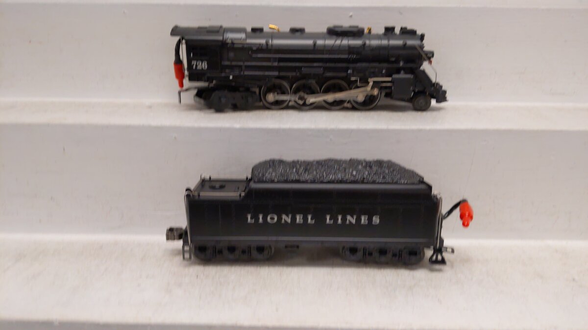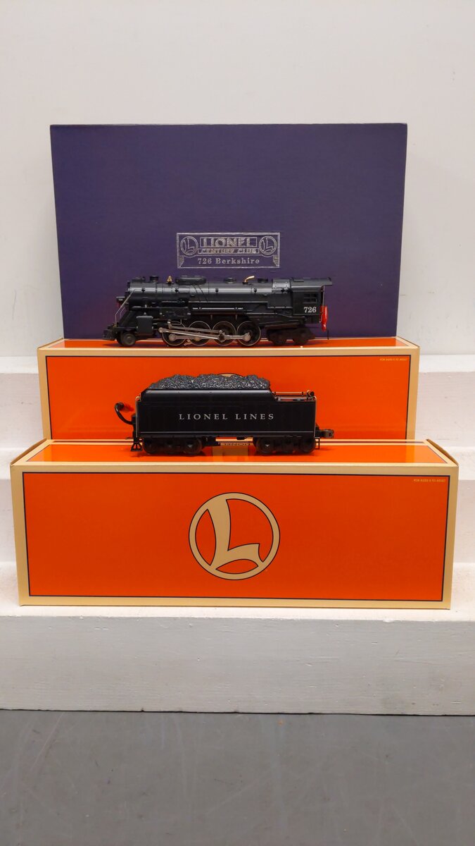 Here is a Lionel 6-18053 O Gauge Century Club Berkshire 2-8-4 Steam Locomotive & Tender #726. This one does not include the matching display case. This engine was available only from Lionel directly and sold only to members of the Lionel Century Club. This engine is a remake of the famous Lionel 726 of the late 1940s. It features Pullmor motor, command controlled, 8-wheel drive system, die-cast metal body, detailed boiler backhead, RailSounds Berkshire digital, 6-wheel trucks, and electro-coupler.