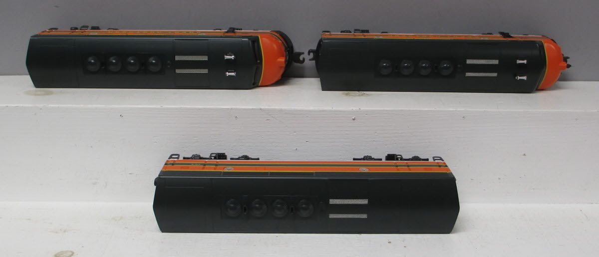 Here is a Lionel 6-11724 O Great Northern F-3 ABA Diesel Locomotive Set from 1992. Included in this set is [1] Powered A unit, [1] Dummy A Unit, and [1] Dummy B Unit. Features include: Dual Pullmor Motors, Eight wheel drive, Magne-Traction, Transformer controlled Forward -Neutral-Reverse operation, working headlights, illuminated number boards, Diesel Railsounds, volume control, & Die-cast metal trucks.