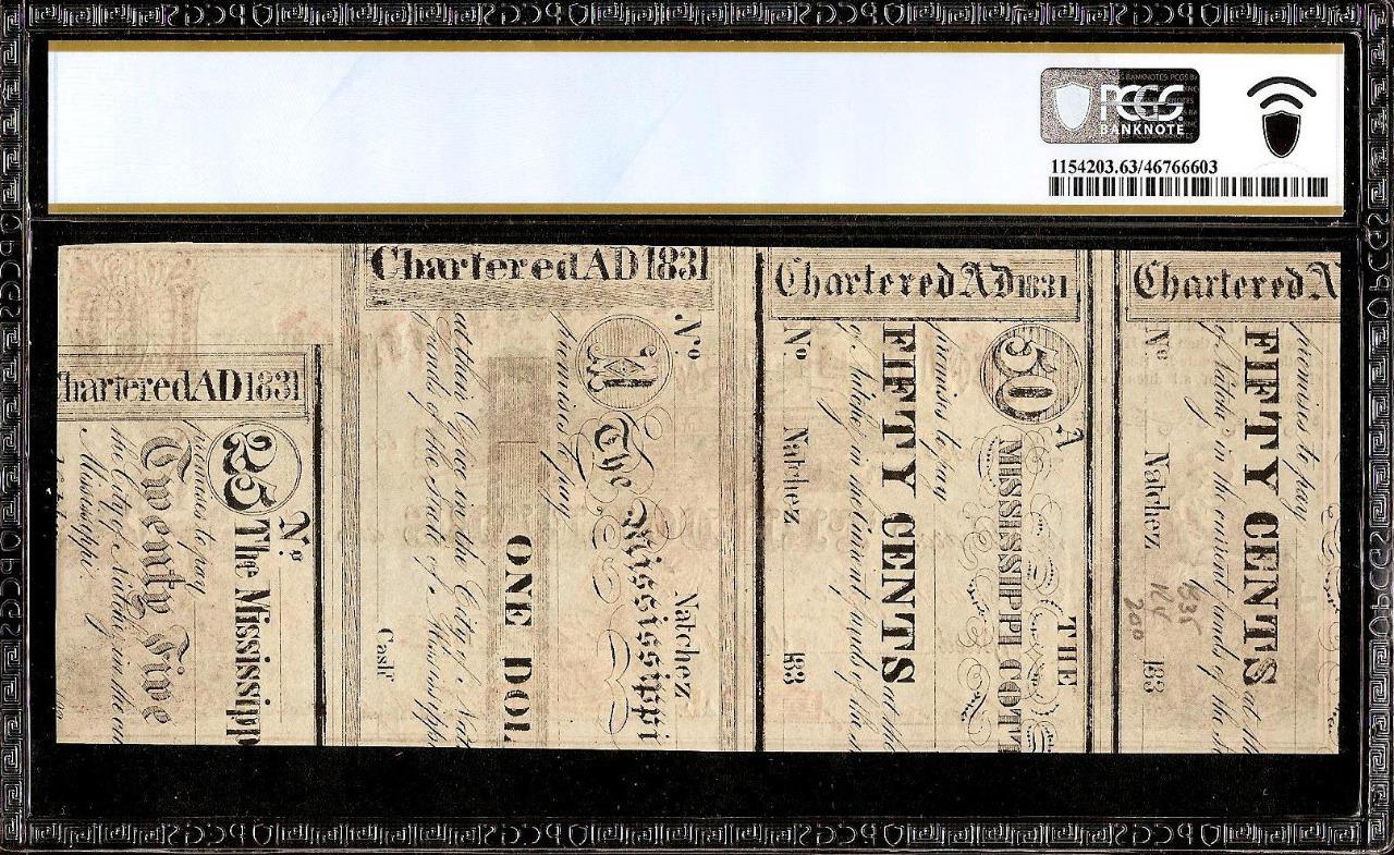 Graded Choice Uncirculated 63 with Premuim Paper Quality by PCGS. It was printed on the backs of Mississippi Cotton Company notes from the 1830s making it a better variety with double the book value of the regular type. A lower grade $20 recently sold for more than I'm asking for this one. And the $20 has a lower Rarity rating.