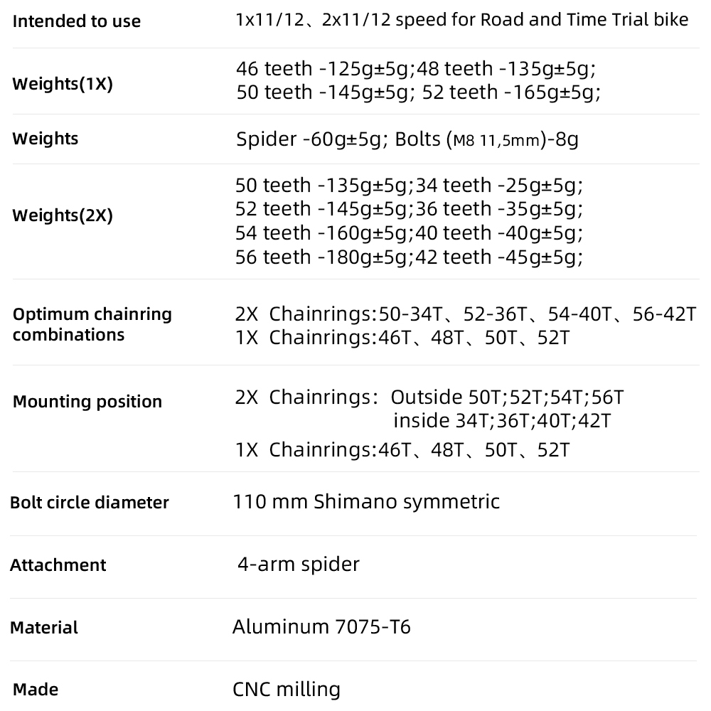 2X Chainrings : Outside 50T; 52T; 54T; 56T ,Inside 34T;36T;40T;42T