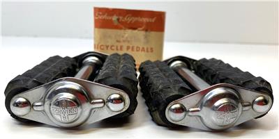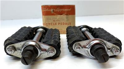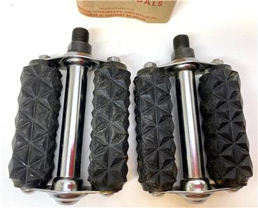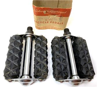 New old stock Schwinn Bicycle Co #6516 pedals. 3-3/8" long by 3" wide. Same pedals that came on 1964 Sting-Rays, but shorter. Correct width for teh Fair Lady.  Slightly dirty from storage/age, but new. 1/2" threads fits on 1 piece cranks. Original wrapper included.