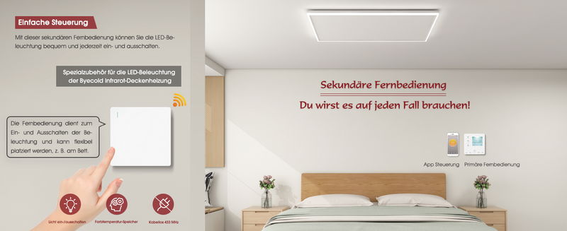 Mit dieser Zusatzfernbedienung steuerst du die LED-Beleuchtung deiner Byecold Infrarot-Deckenheizung jederzeit bequem – auch ohne Smartphone oder Hauptfernbedienung. Platziere sie flexibel dort, wo du sie brauchst, z. B. am Bett.