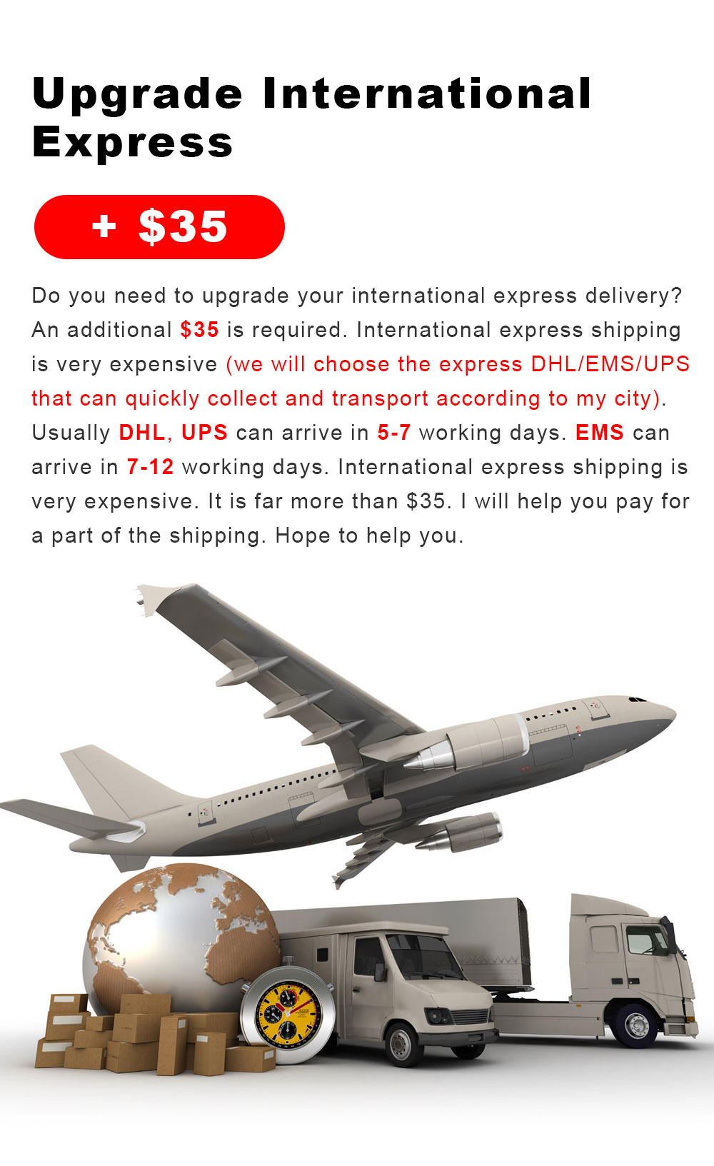 Do you need to upgrade your international express delivery? An additional $35 is required. International express shipping is very expensive (we will choose the express DHL/EMS/UPS that can quickly collect and transport according to my city). Usually DHL, UPS can arrive in 5-7 working days. EMS can arrive in 7-12 working days. International express shipping is very expensive. It is far more than $35. I will help you pay for a part of the shipping. Hope to help you.