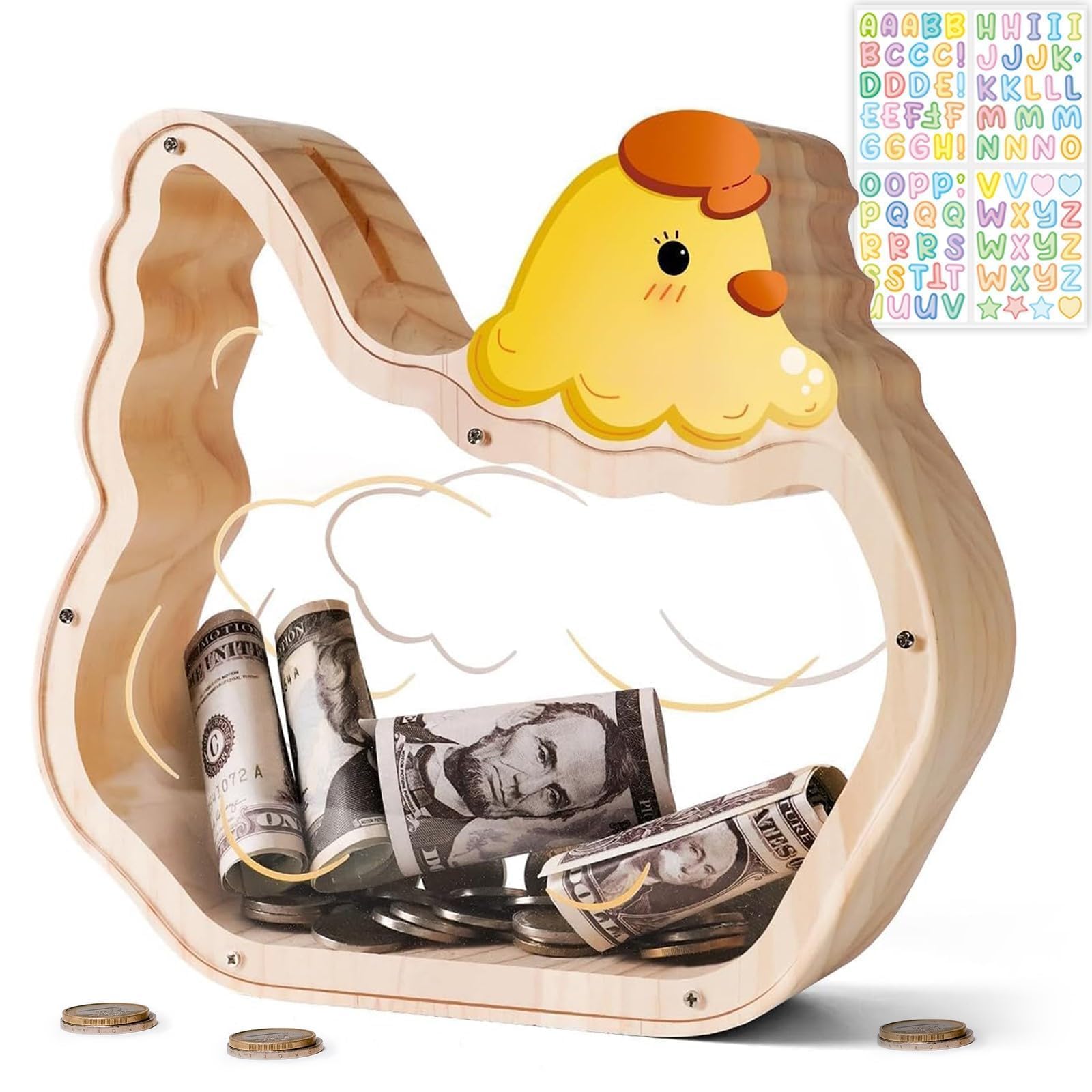Uniwooder Wooden Chicken Piggy Bank for Kids, Unbreakable Pullet Coin Chicken Bank for Kids with Letter Sticker, Wooden Cashbox Money Jar Personalizable, Educational Toy for Boys, Girls