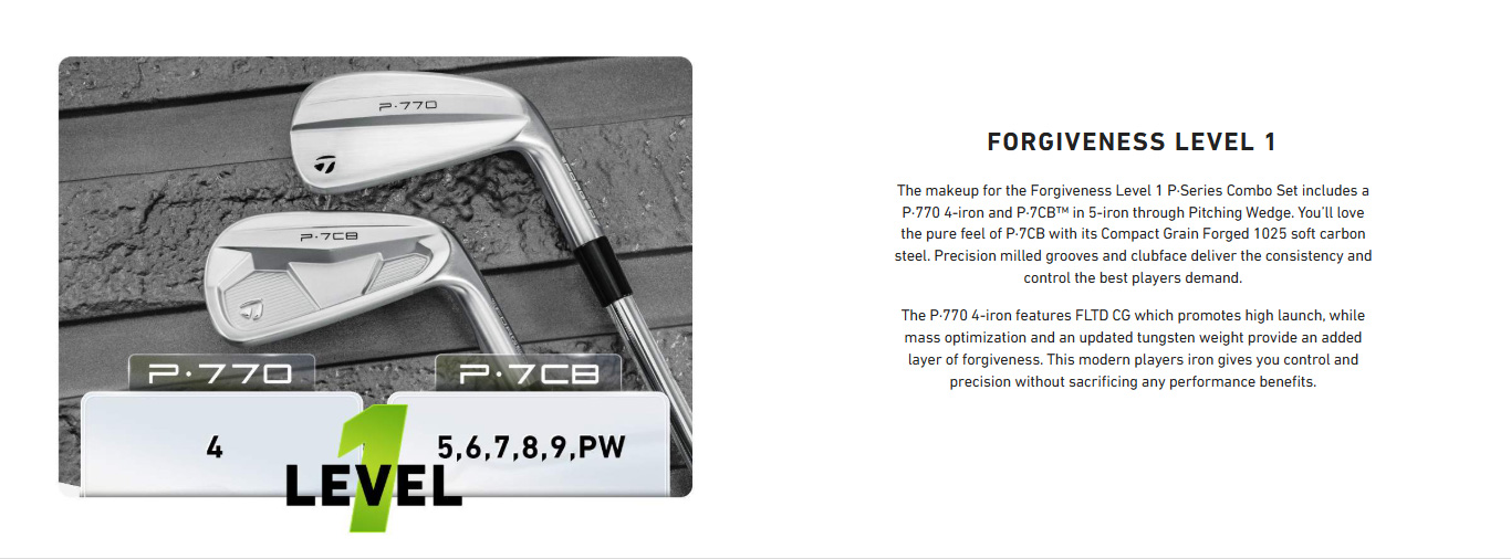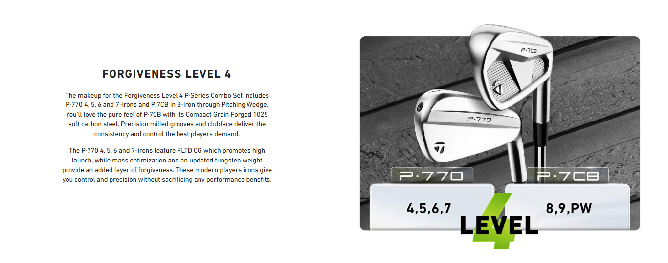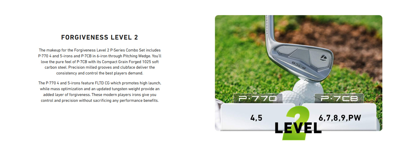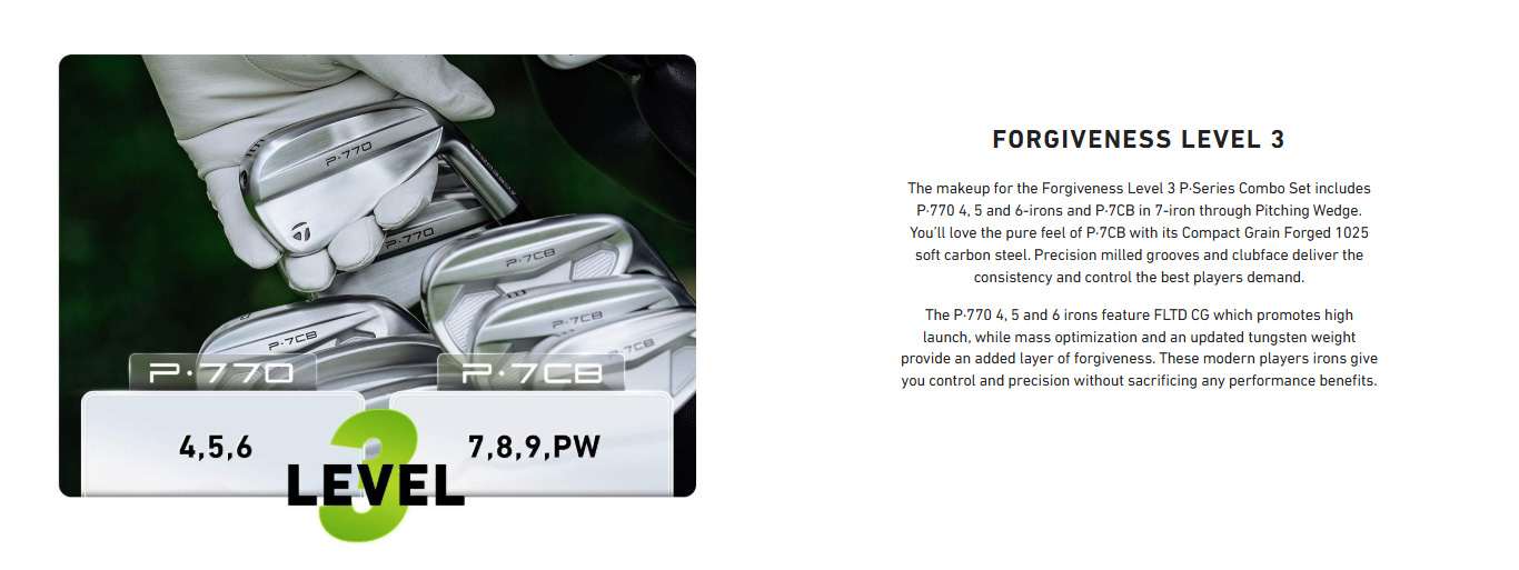 There’s no rule that says you have to play the same irons for your whole set, the best players in the world don’t. To date, Collin Morikawa, Rory McIlroy, Tiger Woods, Tommy Fleetwood and Nelly Korda have all played various combinations of P·Series irons. Just like the Pros, you can optimize your bag’s iron makeup to maximize your ball striking performance. The makeup for the Forgiveness Level 1 P·Series Combo Set includes a P·770 4-iron and P·7CB™ in 5-iron through Pitching Wedge. You’ll love the pure feel of P·7CB with its Compact Grain Forged 1025 soft carbon steel. Precision milled grooves and clubface deliver the consistency and control the best players demand. The makeup for the Forgiveness Level 2 P·Series Combo Set includes P·770 4 and 5-irons and P·7CB in 6-iron through Pitching Wedge. You’ll love the pure feel of P·7CB with its Compact Grain Forged 1025 soft carbon steel. Precision milled grooves and clubface deliver the consistency and control the best players demand. The makeup for the Forgiveness Level 3 P·Series Combo Set includes P·770 4, 5 and 6-irons and P·7CB in 7-iron through Pitching Wedge. You’ll love the pure feel of P·7CB with its Compact Grain Forged 1025 soft carbon steel. Precision milled grooves and clubface deliver the consistency and control the best players demand. The makeup for the Forgiveness Level 4 P·Series Combo Set includes P·770 4, 5, 6 and 7-irons and P·7CB in 8-iron through Pitching Wedge. You’ll love the pure feel of P·7CB with its Compact Grain Forged 1025 soft carbon steel. Precision milled grooves and clubface deliver the consistency and control the best players demand.