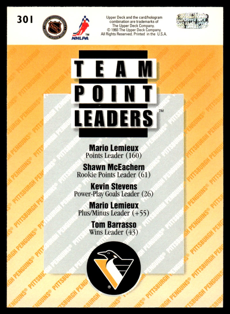 | 1993-94 Upper Deck MARIO LEMIEUX #301 Penguins Team Point Leader HOF | ||||||||||||||||||