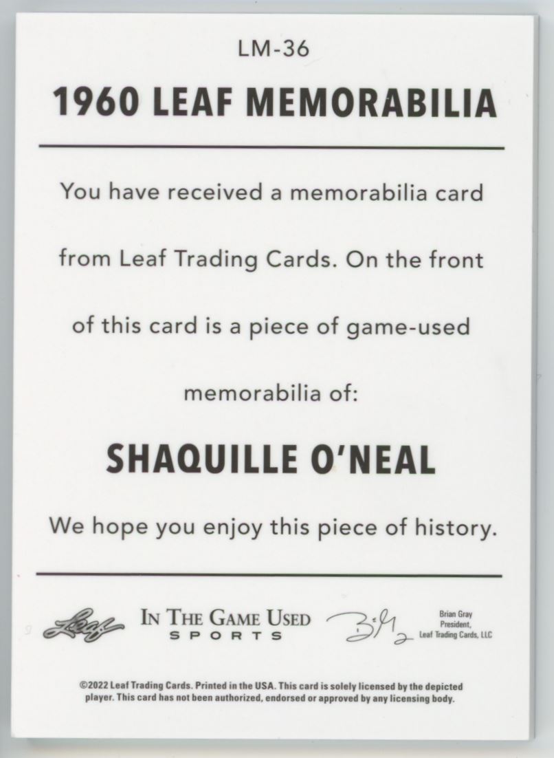 | 2022-23 Leaf memorabilia 1960 Jersey Game used 10/12 Shaquille O'Neal #LM-36 |