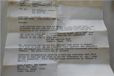 This is a very old Vibroplex telegraph key. The nameplate is worn and barely readable but paperwork says it's No. 72337 (see photo). Please view listing images. What you see is what you get.
