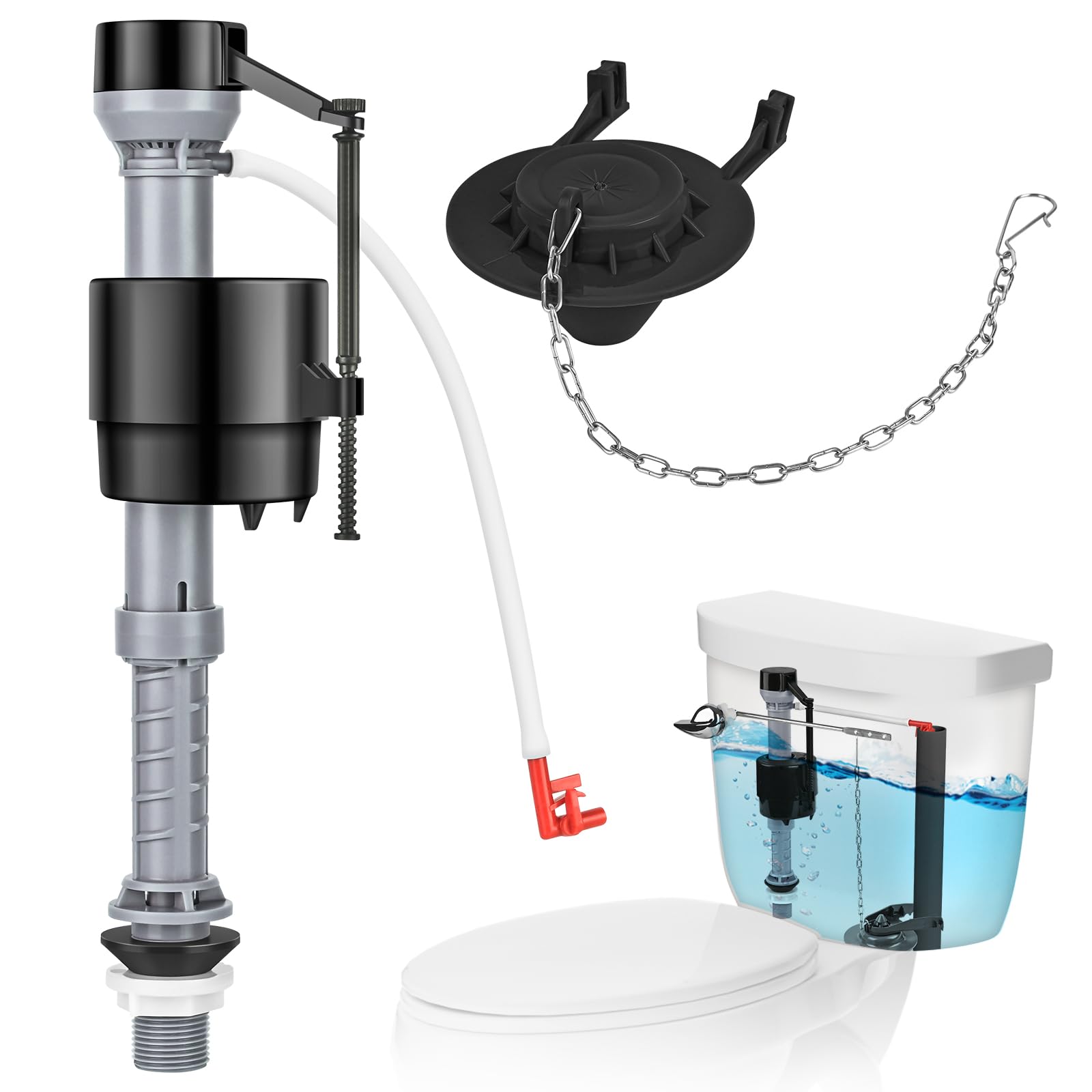 Universal Toilet Fill Valve Kit – Upgrade Your Toilet’s Performance with a Reliable, Water-Saving Solution Enhance your toilet’s efficiency with the Universal Toilet Fill Valve Kit, a high-quality universal toilet repair kit designed for superior performance and easy installation. This toilet kit inside tank is compatible with most standard toilets and ensures a quieter, leak-proof, and water-efficient flushing experience. Whether you need to fix slow filling, continuous running, or leaks, this toilet internal kit provides a simple and effective DIY solution. Key Features & Benefits: Universal Compatibility – This toilet parts inside tank kit is designed to fit most toilet models and brands. Featuring a US standard G15/16" inlet and adjustable height (8 to 13 inches), it ensures a precise fit for various toilet water tank parts. Performance Upgrade – Resolve common toilet issues such as slow filling, noise, leaks, and continuous running with this high-performance toilet guts kit. Enjoy a quieter and more efficient flush with rapid tank refilling and improved water flow. Water-Saving Design – Customize your flush using adjustable tank and bowl water level controls. The fill valve for toilet tank delivers the optimal water amount, helping you conserve water and reduce your water bill without compromising performance. Leak Prevention Technology – The V-shaped silicone seal ensures a secure, watertight fit, while the durable, corrosion-resistant rubber flapper provides long-lasting leak-proof performance. This toilet pump kit prevents wasted water and costly leaks. Easy DIY Installation – This toilet bowl flusher kit is designed for quick and hassle-free installation. Simply remove the old components and replace them with the new ones—no professional tools or plumbing experience required. The toilet ballcock kit ensures a smooth and efficient upgrade to your toilet system. Upgrade your toilet with the Universal Toilet Fill Valve Kit and enjoy a reliable, quiet, and water-efficient performance every day.