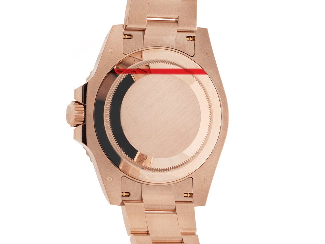 Lünette18kt Roségold gerädelt mit braun / schwarzem Keramik Inlay, graviert mit roségoldener 24-Stunden Skala, beidseitig drehbar