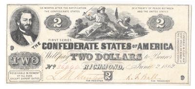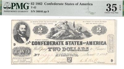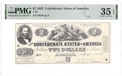 T-42 PF-2 1862 $2 Confederate Full Framed,Bright Beautiful PMG VF35 EPQ CSA Note