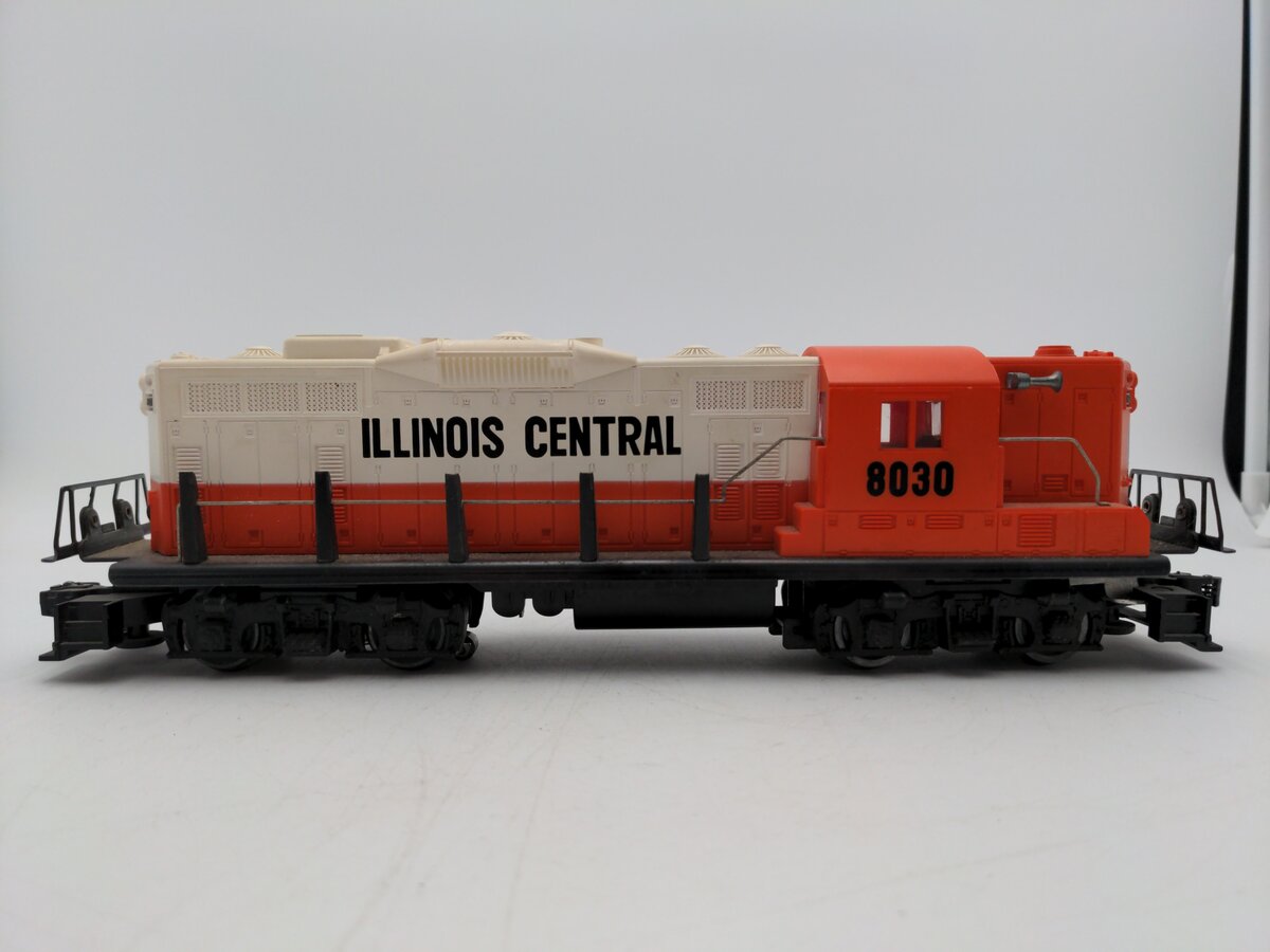 Here is a Lionel 6-8030 O Gauge Illinois Central GP-9 Diesel Locomotive #8030 from 1970-72. Features include a plastic construction, die-cast metal trucks, a pullmor motor, transformer controlled forward, neutral and reverse operation, an operating headlight, illuminated number boards and metal wheels and axles.