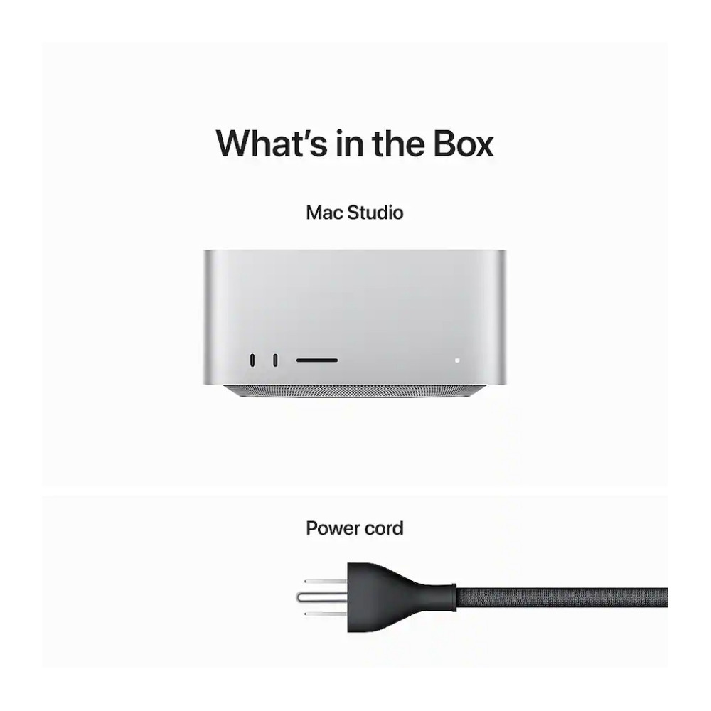 Apple Mac Studio, power cord. Ready to use out of the box, with all essential components for immediate setup.