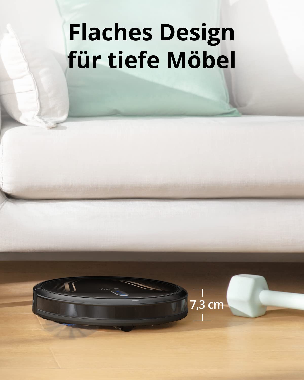 Superduennes Design fuer Reinigung unter Moebelstuecken: Nie wieder Sofa und Co. hochheben, um darunter staubzusaugen. Mit nur 7,3 cm Hoehe passt der G40 Hybrid+ in jede noch so schmale Nische unter den Moebeln.