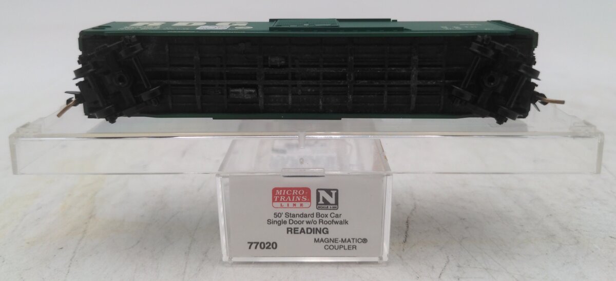 Here is a Micro-Trains 07700020 N Scale Reading 50' Standard Single Door Boxcar #20054. This car features plastic construction, plastic trucks, plastic wheels and axles, and knuckle couplers.