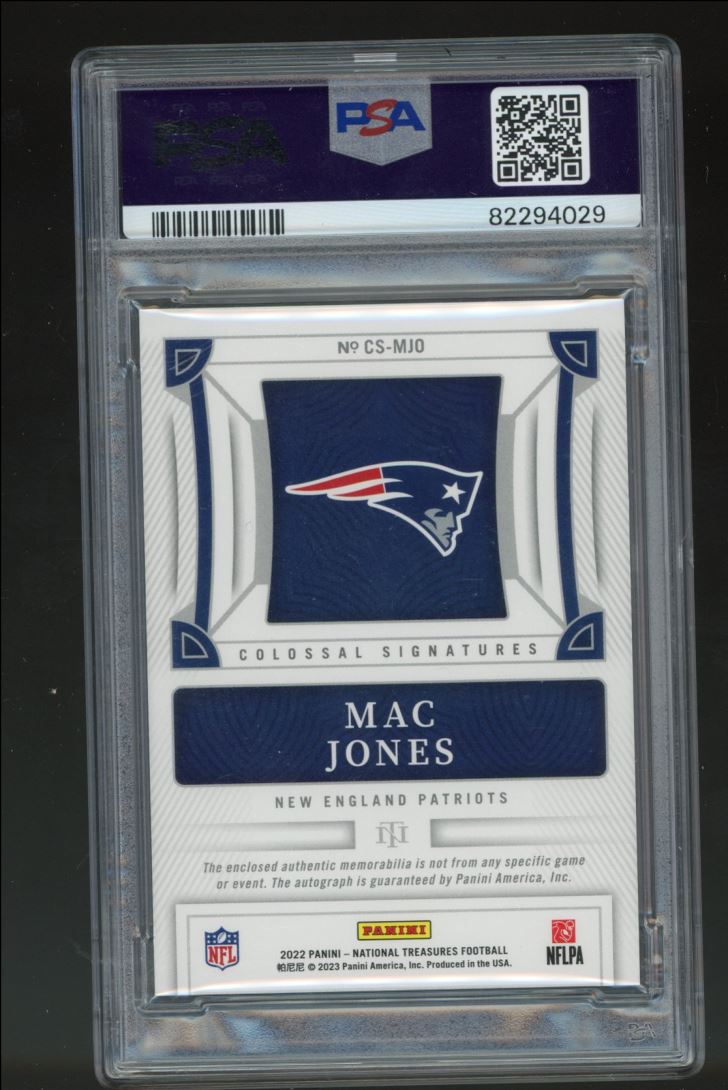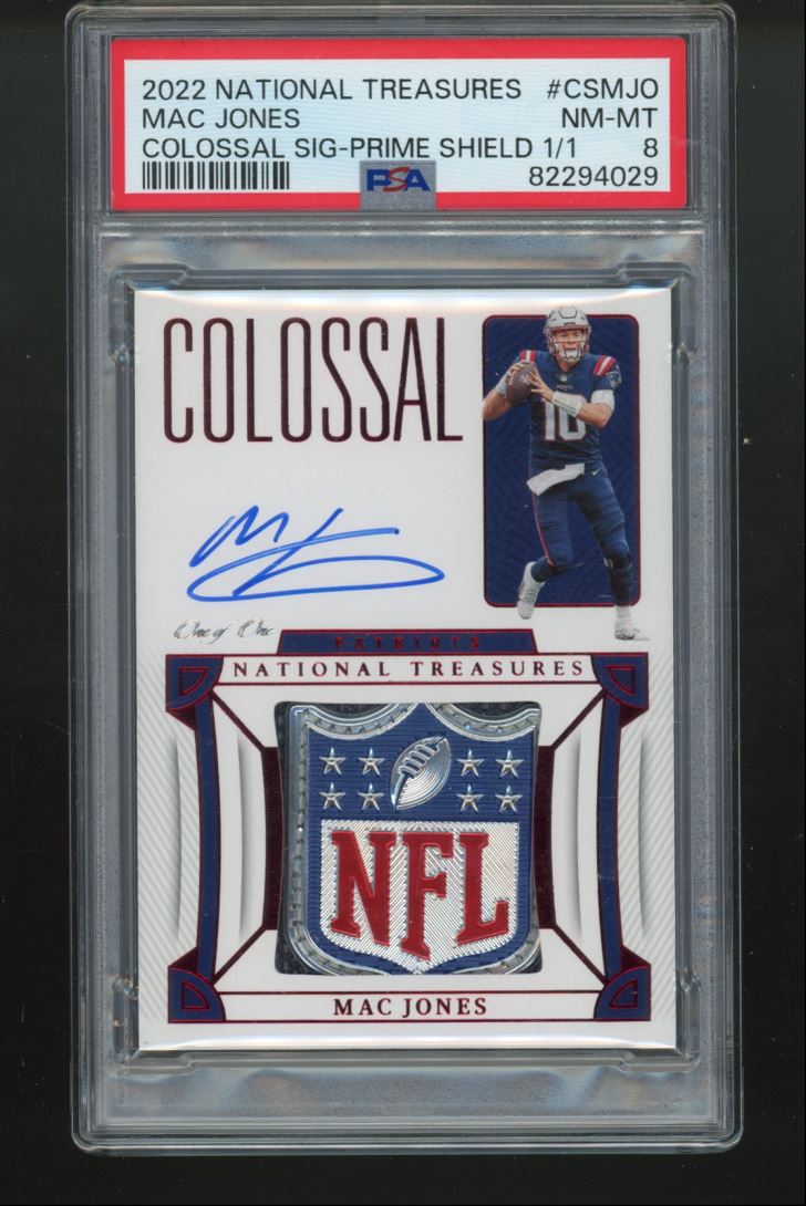 | 2022 Panini National Treasures Mac Jones Colossal NFL Shield Patch Auto 1/1 |