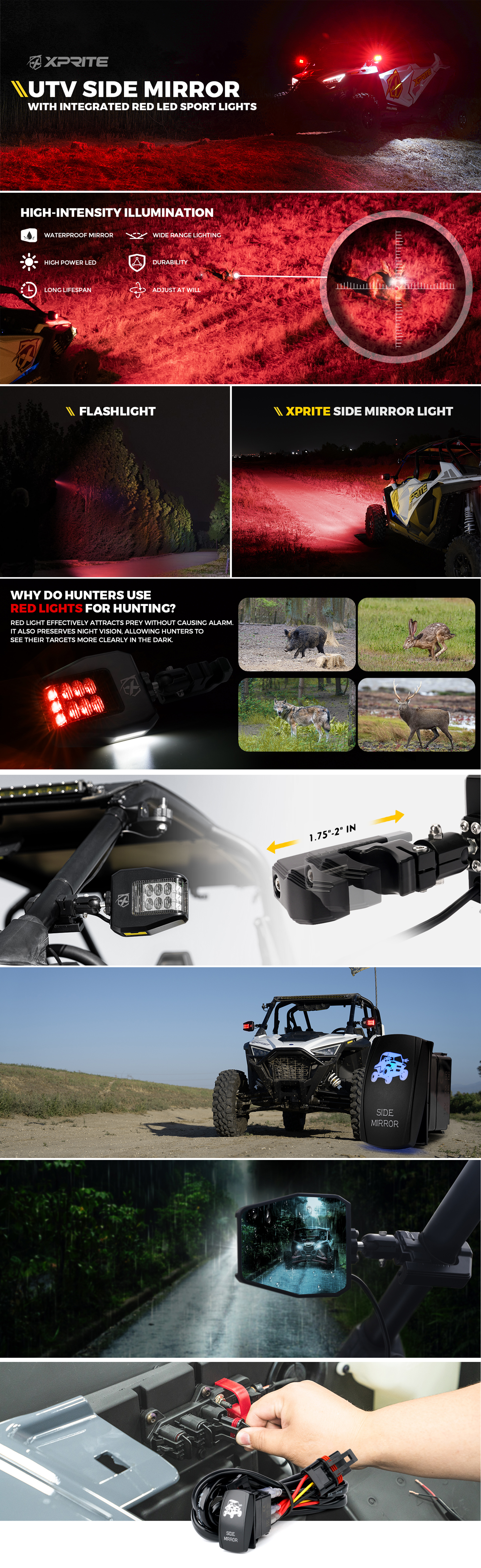 HIGH-POWERED RED LED LIGHTING - 2024 newly upgraded UTV side mirrors featuring integrated red LED lights. The red lighting offers discreet illumination that won’t spook wildlife,allowing you to stay focused and increase your chances of success. Designed to enhance your nighttime driving experience without disrupting hunting activities,our mirrors are perfect for night hunting and off-road exploration.