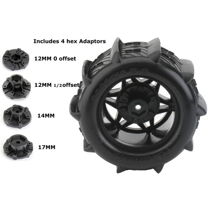 This is a Power Hobby PHT2187 1:10 Rooster 2.8 Belted Paddle Sand Snow Tires 12mm 14mm 17mm. Features: Medium treated profile for the maximum traction and the maximum lateral grip. Inside belt flexible but very strong, vulcanized directly together with tire compound. Insert foam with special material for high temperatures, WJ cut for high precision. Spoked wheel molded with special material and with a flexible structure for maximum grip and stability.