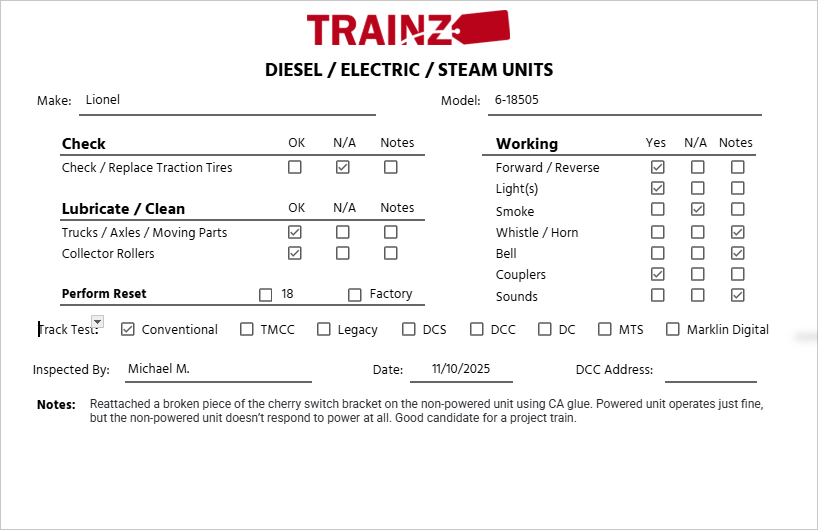 This item has been graded per TCA standards C-8: Like New. This item has been inspected by our repair shop. Please see the attached picture for inspection details and additional operation information. This item appears to have been run sparingly, and displays overall signs of very light previous use. The original paint is in great shape, and the rest of the unit displays a like-new overall finish. As is. The powered unit operates as it should, but the dummy unit does not receive any power. The original box is included. Please check the photos for a detailed look at this item. Overall condition is Like New.