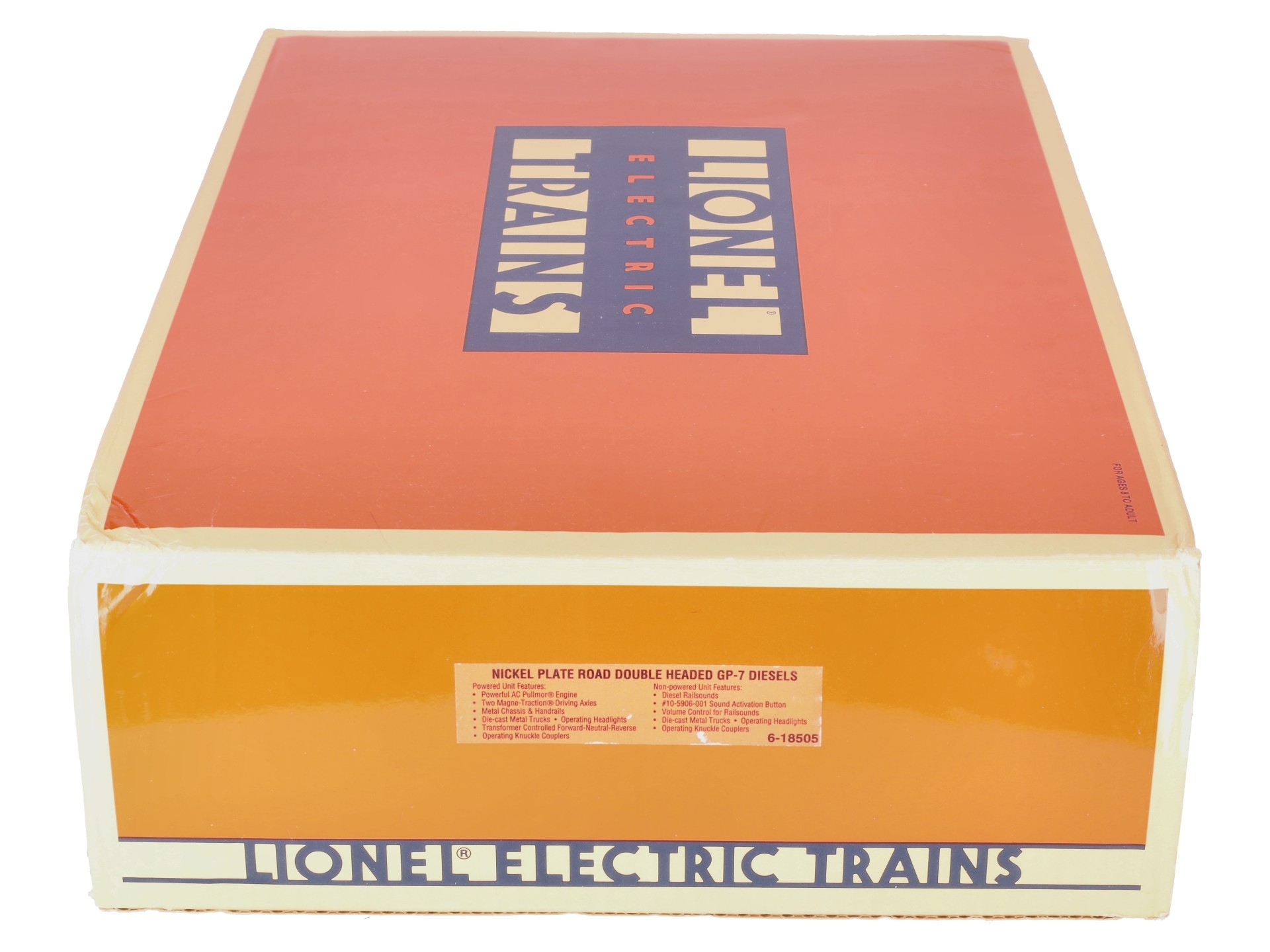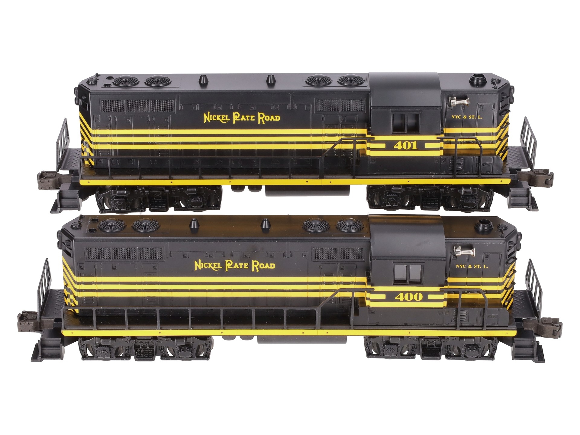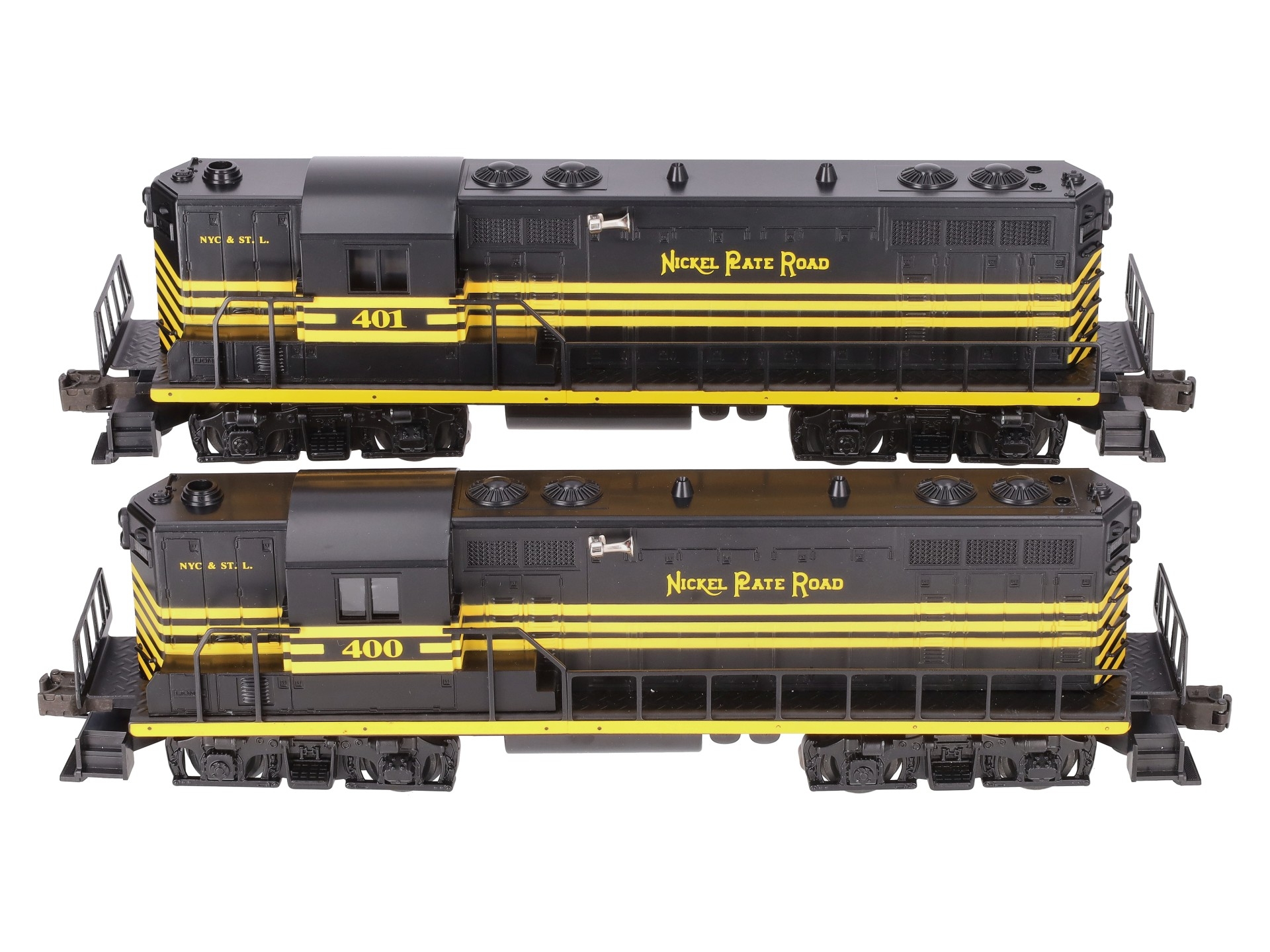Here is a Lionel 6-18505 O Gauge Nickel Plate Road GP-7 Diesel Locomotive Set #400/401 from 1993. These engines headed up the Nickel Plate Road Fallen Flags set from that year. The powered unit features include powerful AC pullmor engine, two magne traction driving axles, metal chassis and handrails, die-cast metal trucks, operating headlights, transformer controlled forward-neutral-reverse and operating couplers. The non-powered unit features diesel railsounds, #10-5906-001 sound activation button, volume control for railsounds, die-cast metal trucks, operating headlights and operating knuckle couplers.