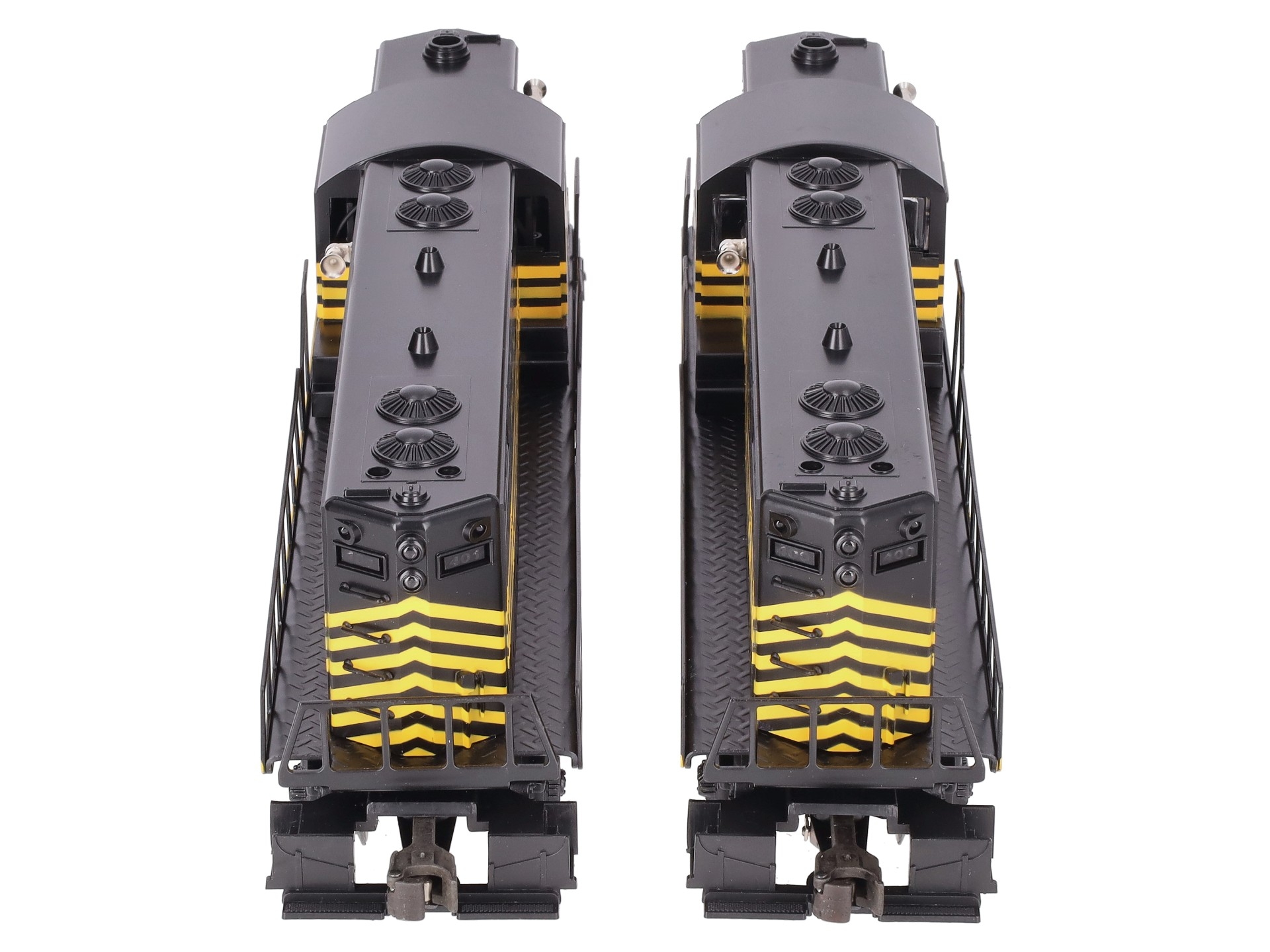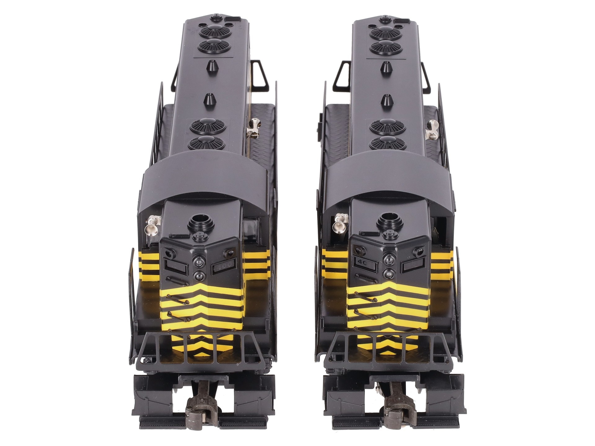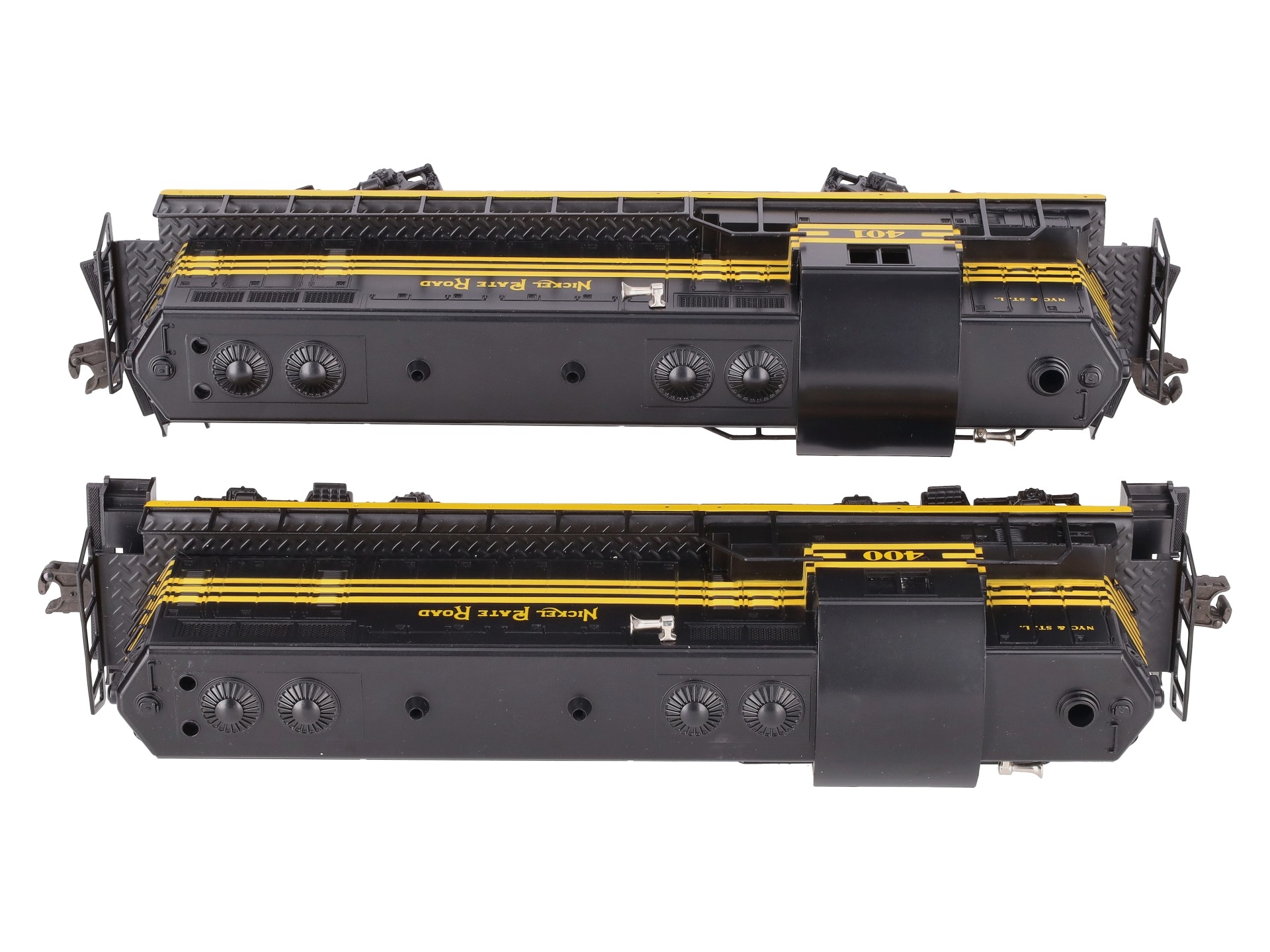 Here is a Lionel 6-18505 O Gauge Nickel Plate Road GP-7 Diesel Locomotive Set #400/401 from 1993. These engines headed up the Nickel Plate Road Fallen Flags set from that year. The powered unit features include powerful AC pullmor engine, two magne traction driving axles, metal chassis and handrails, die-cast metal trucks, operating headlights, transformer controlled forward-neutral-reverse and operating couplers. The non-powered unit features diesel railsounds, #10-5906-001 sound activation button, volume control for railsounds, die-cast metal trucks, operating headlights and operating knuckle couplers.