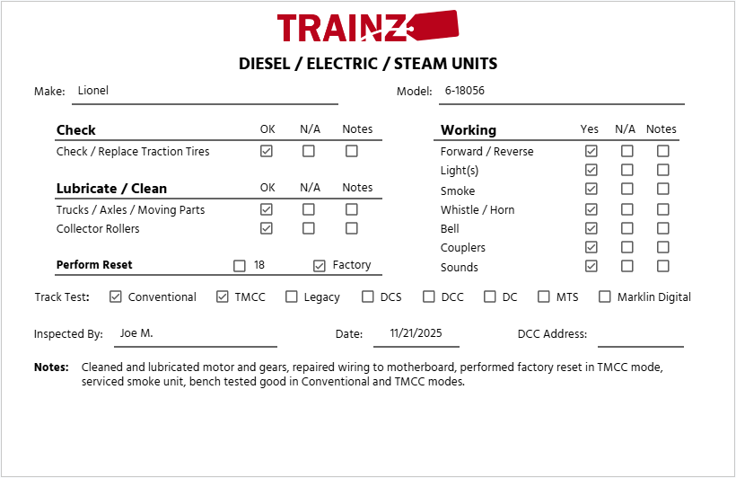 This item has been graded per TCA standards C-7: Excellent based on visual appearance. The tender has some broken stanchions resulting in lose roof railing. The locomotive and tender both show some pitting in the shell paint. The locomotive and tender show scratches and spots of paint loss throughout various sections of the shell and chassis. This item has been inspected by our repair shop. Please see the attached picture for inspection details and additional operation information. The instruction manual is included. The original box is included. Please check the photos for a detailed look at this item. Overall condition is Excellent.