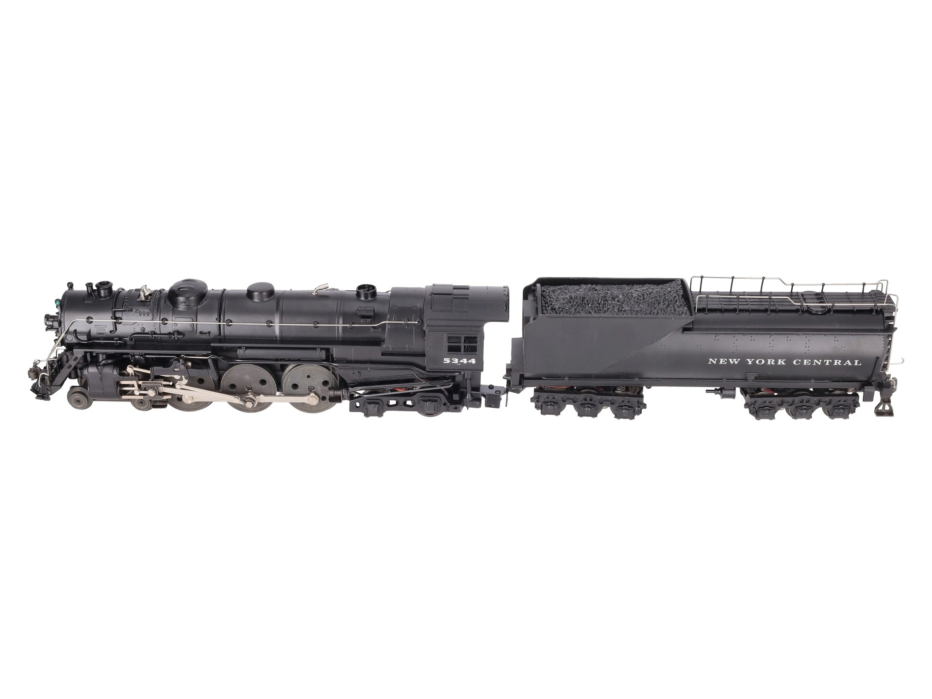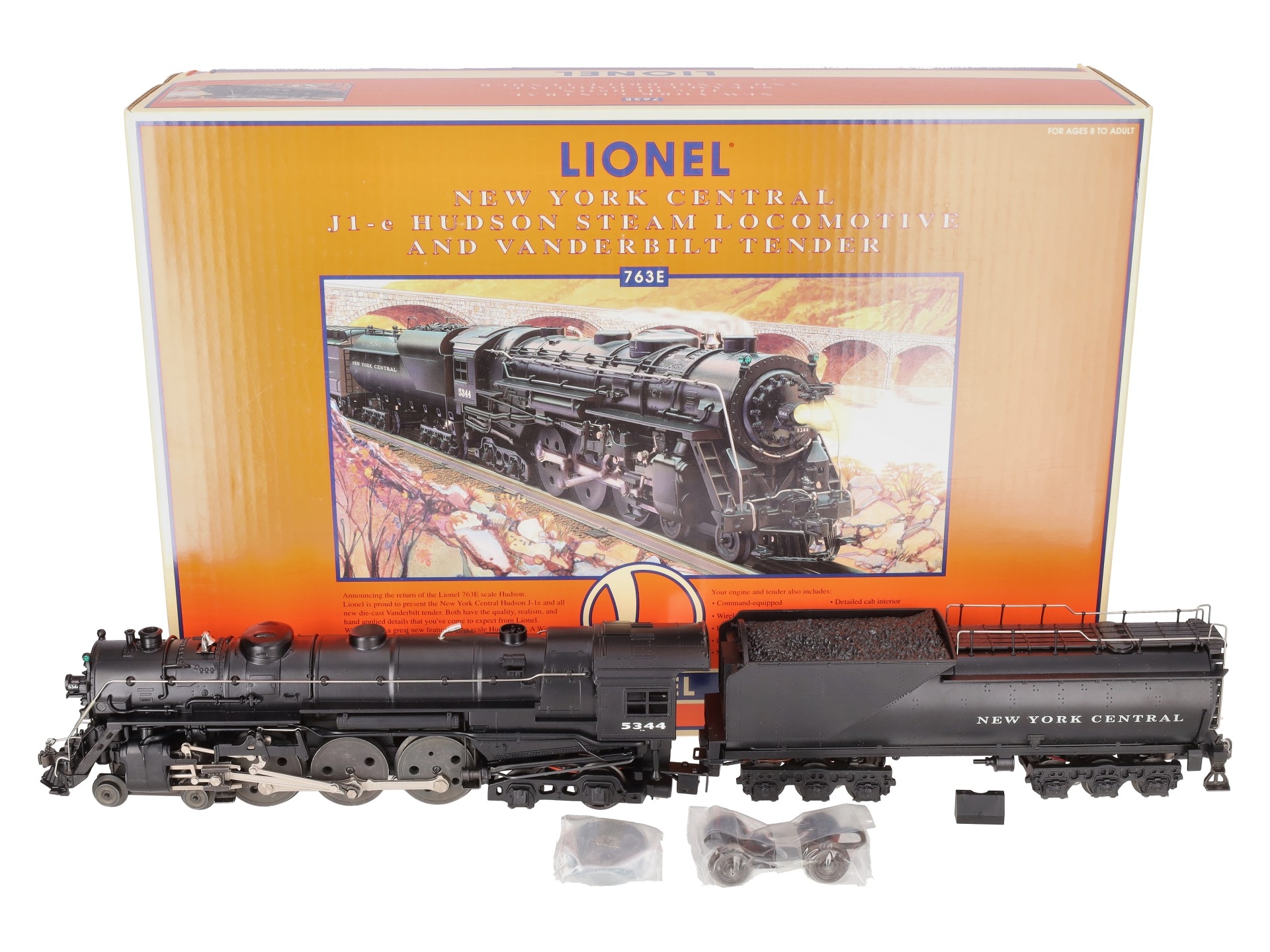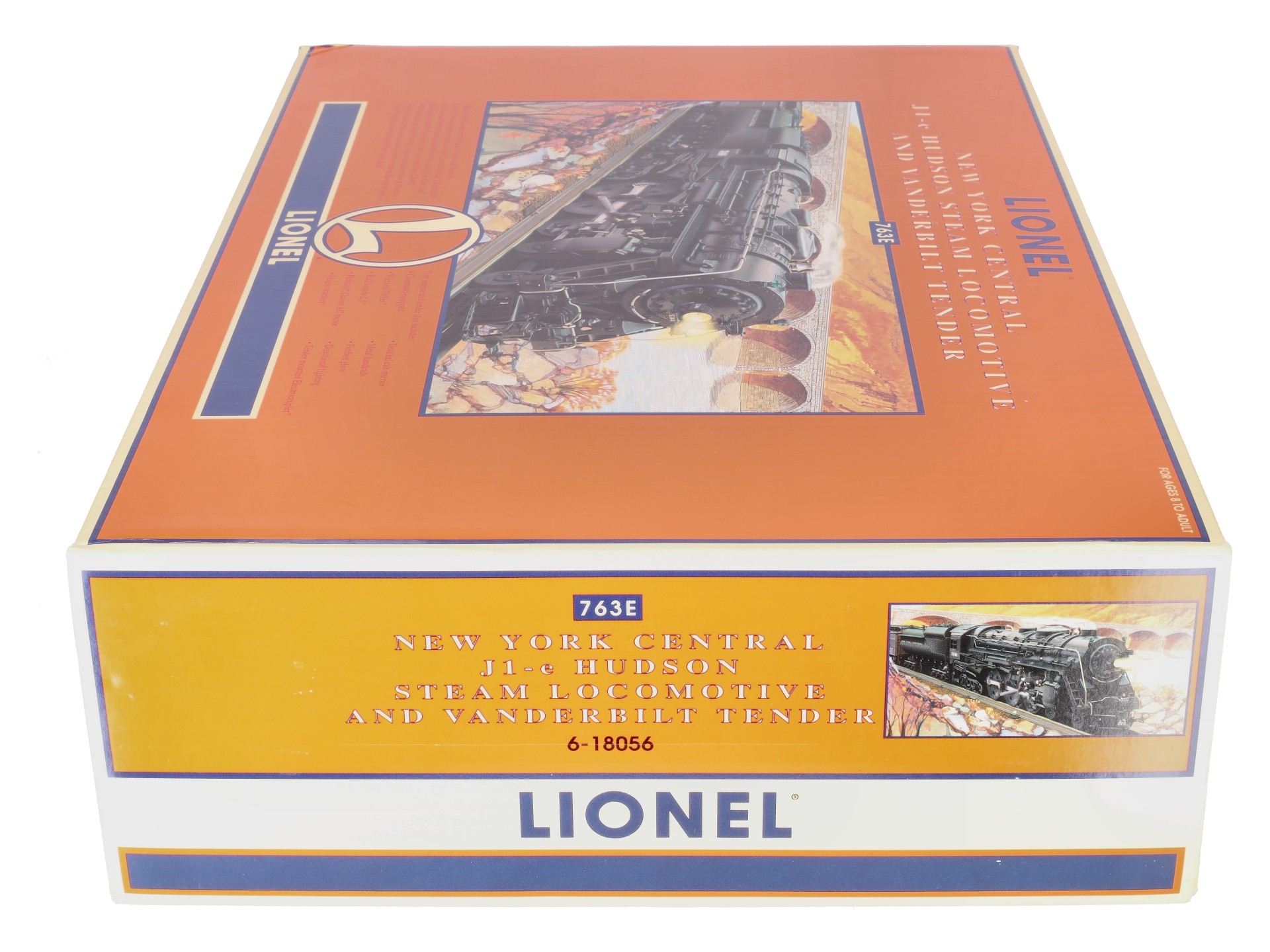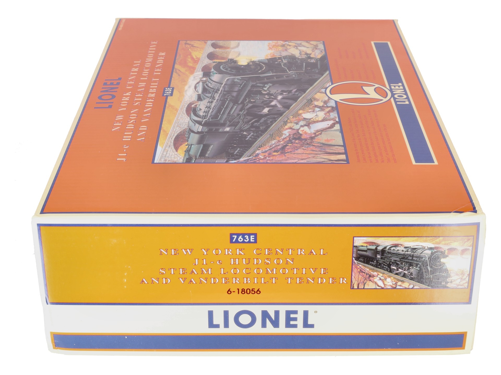 Here is a Lionel 6-18056 O New York Central 763E J1E 4-6-4 Hudson Steam Locomotive & Vanderbilt Tender from 1997. The die-cast Locomotive features a Pullmor motor, operating headlight, smoke unit, magne-traction, wireless tether, detailed cab interior, metal handrails, firebox glow, directional lighting and is command equipped. The Tender is die-cast metal as well and features RailSounds 2.5, die-cast metal trucks, a rear electrocoupler, metal wheels and axles.