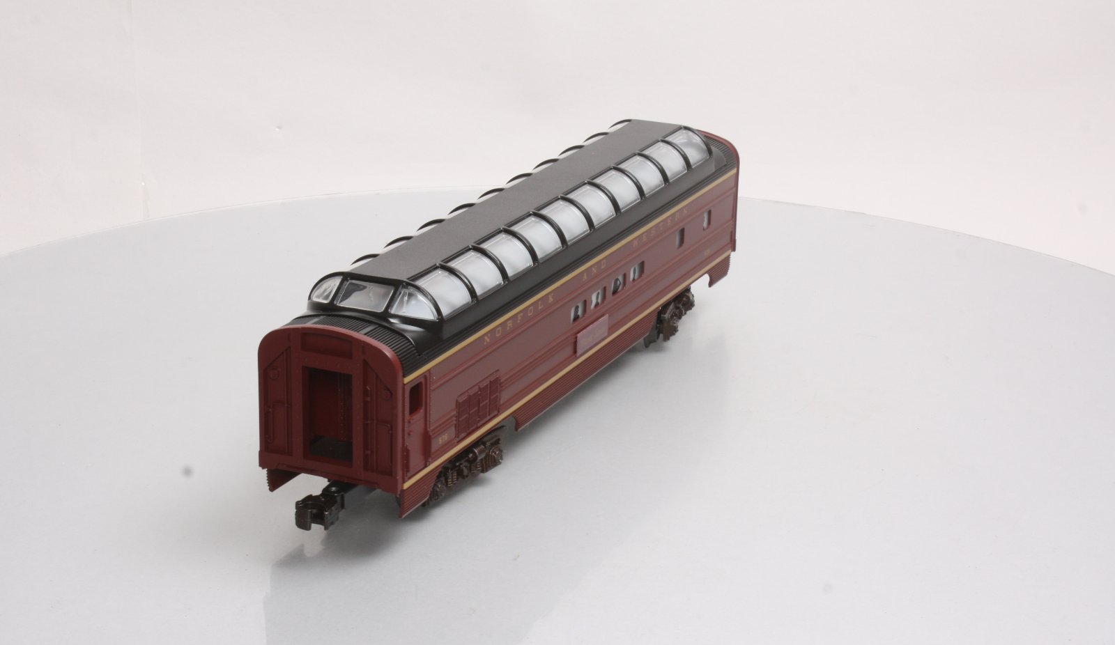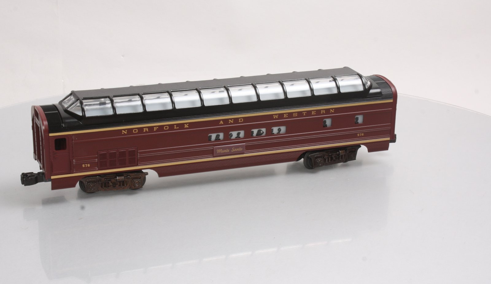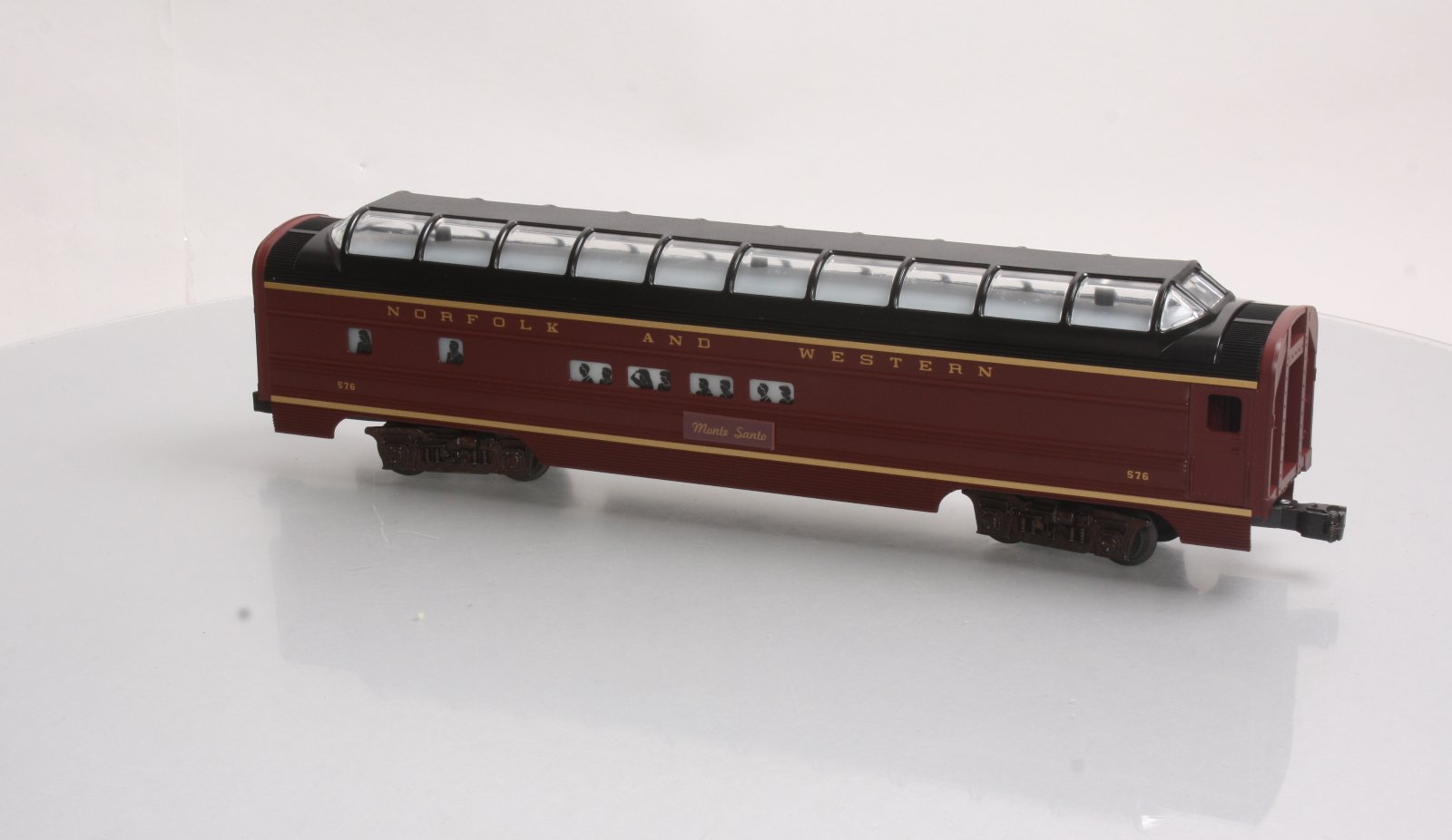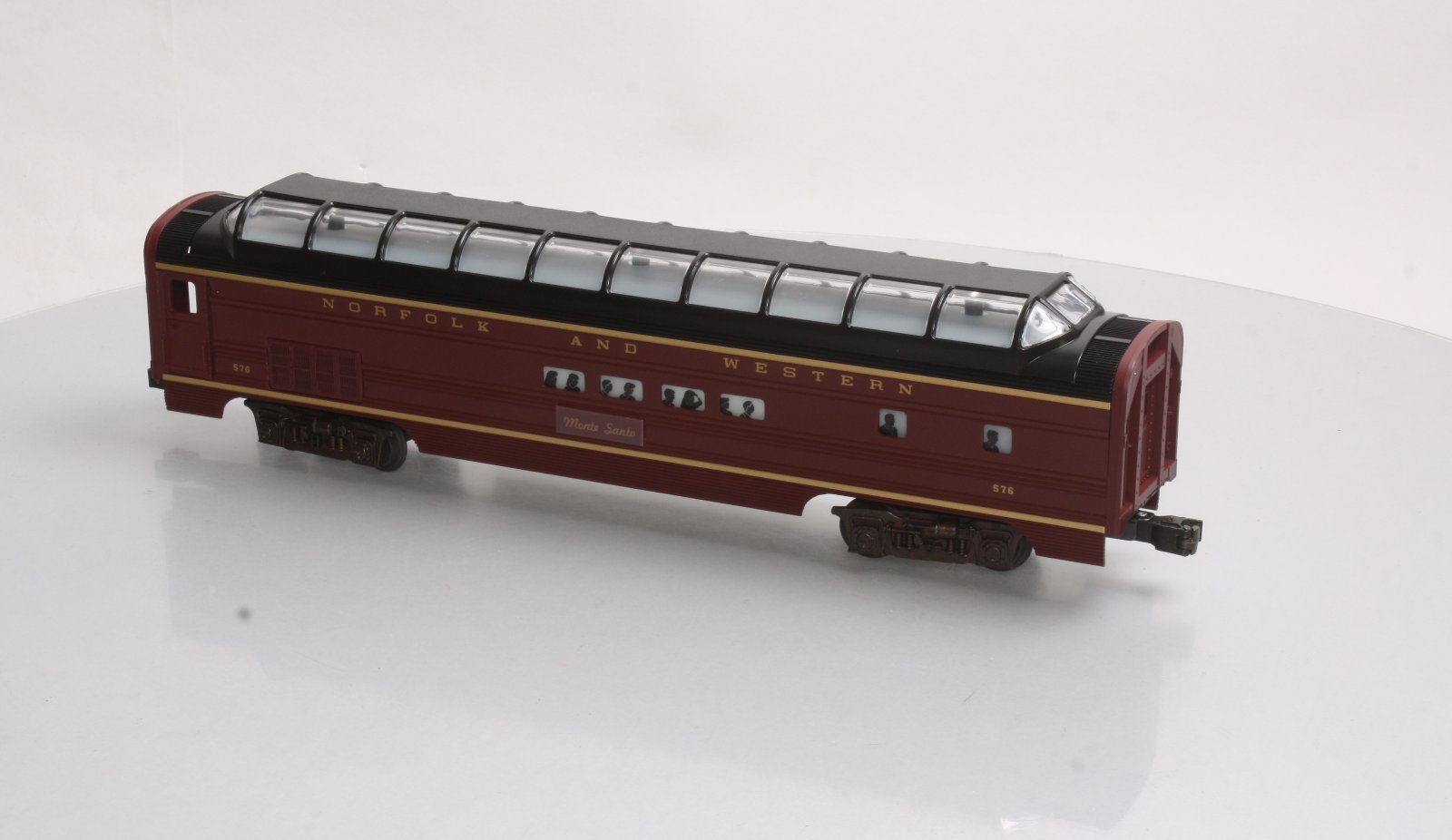 Here is a Lionel 6-19108 O Gauge Norfolk & Western "Monte Santo" Full Vista Dome Car #576 from 1989. This car is an add-on car to the Norfolk and Western Powhatan Arrow Passenger Set from the 1980s. It features an illuminated interior with passenger silhouetted windows, die-cast trucks with operating couplers, and metal wheels and axles. This car measures approximately 15 inches long.