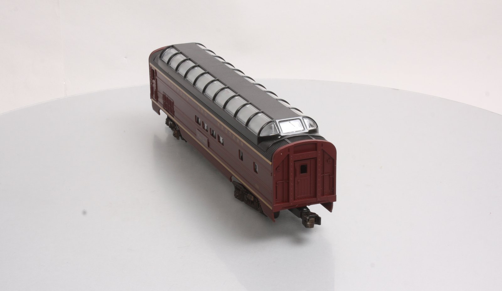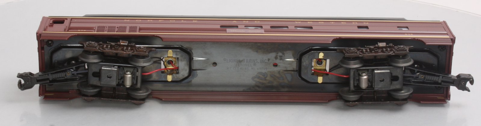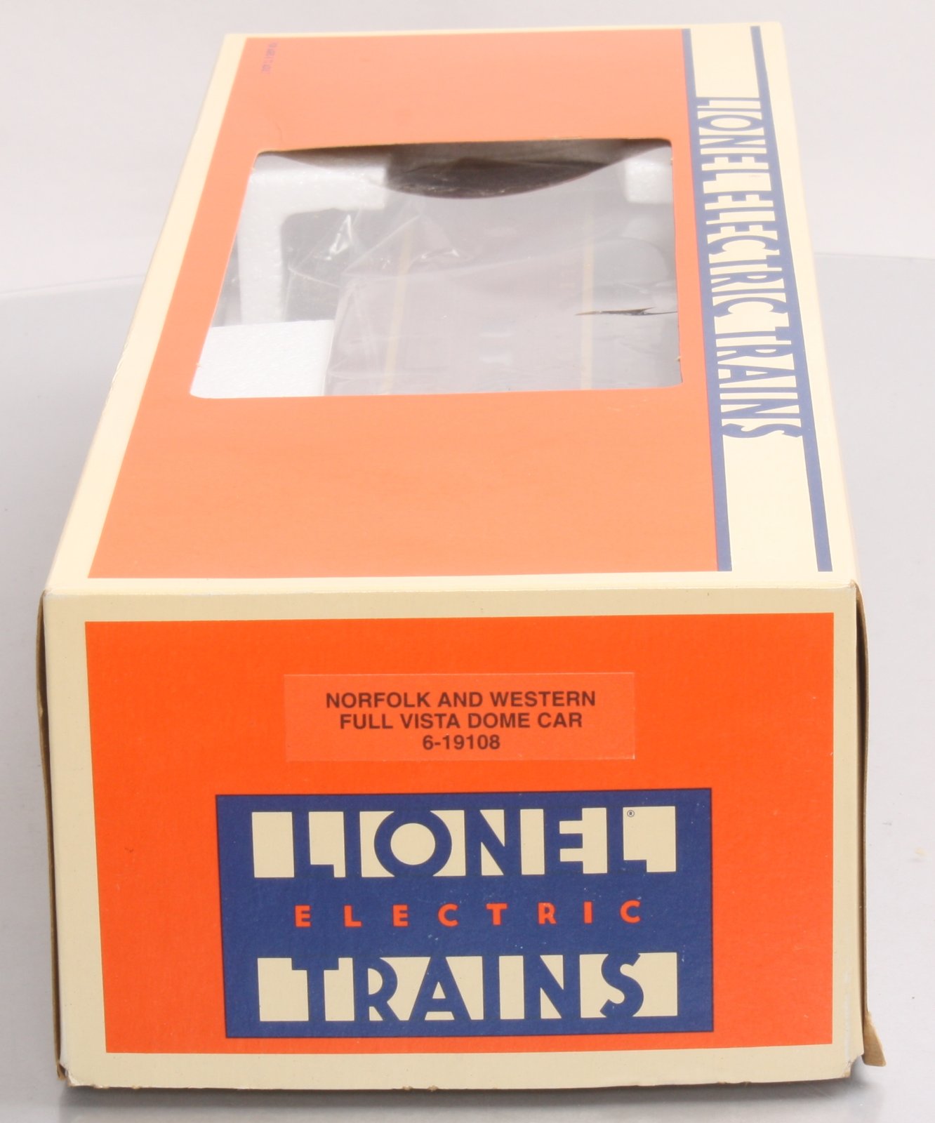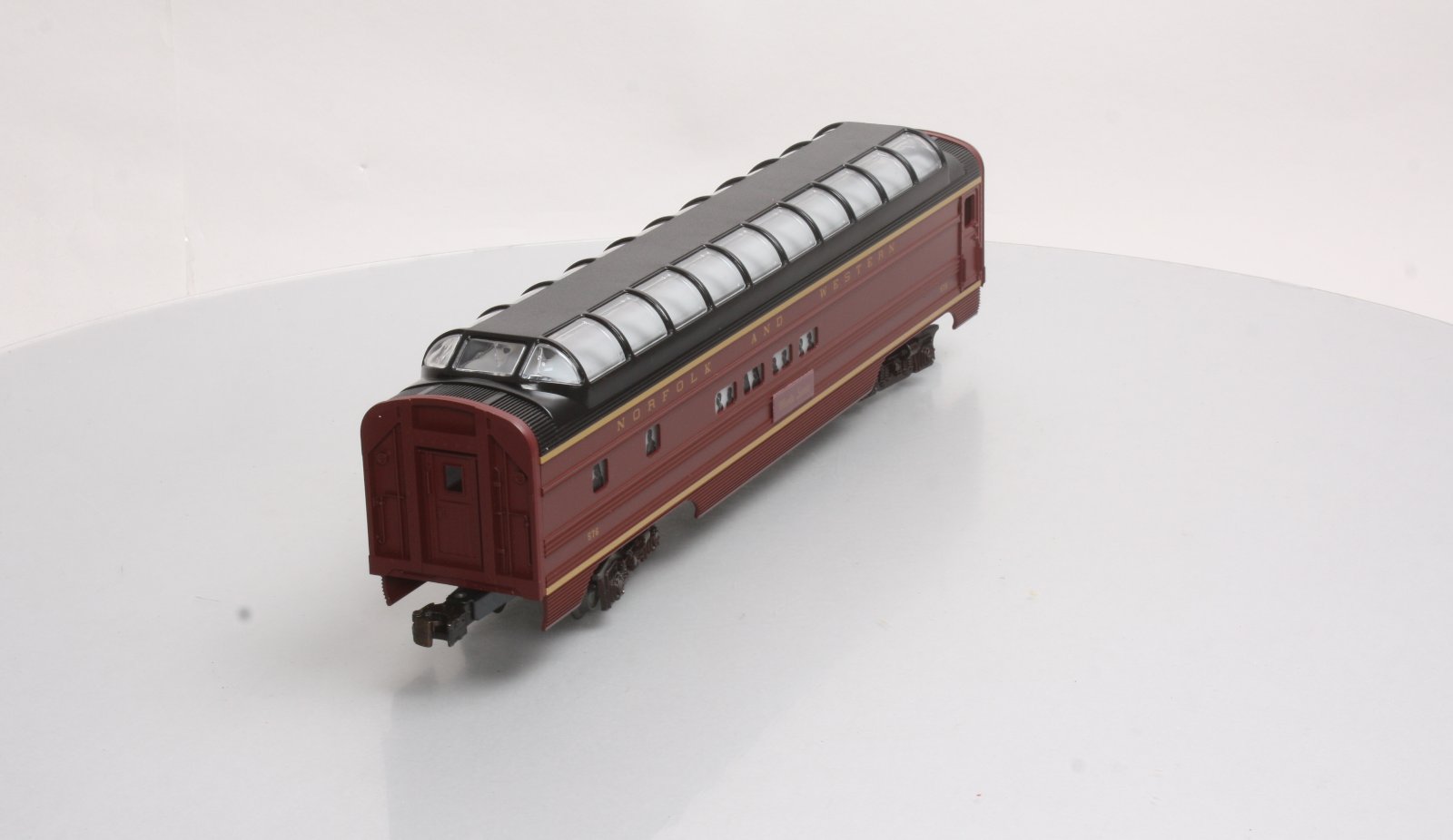 Here is a Lionel 6-19108 O Gauge Norfolk & Western "Monte Santo" Full Vista Dome Car #576 from 1989. This car is an add-on car to the Norfolk and Western Powhatan Arrow Passenger Set from the 1980s. It features an illuminated interior with passenger silhouetted windows, die-cast trucks with operating couplers, and metal wheels and axles. This car measures approximately 15 inches long.