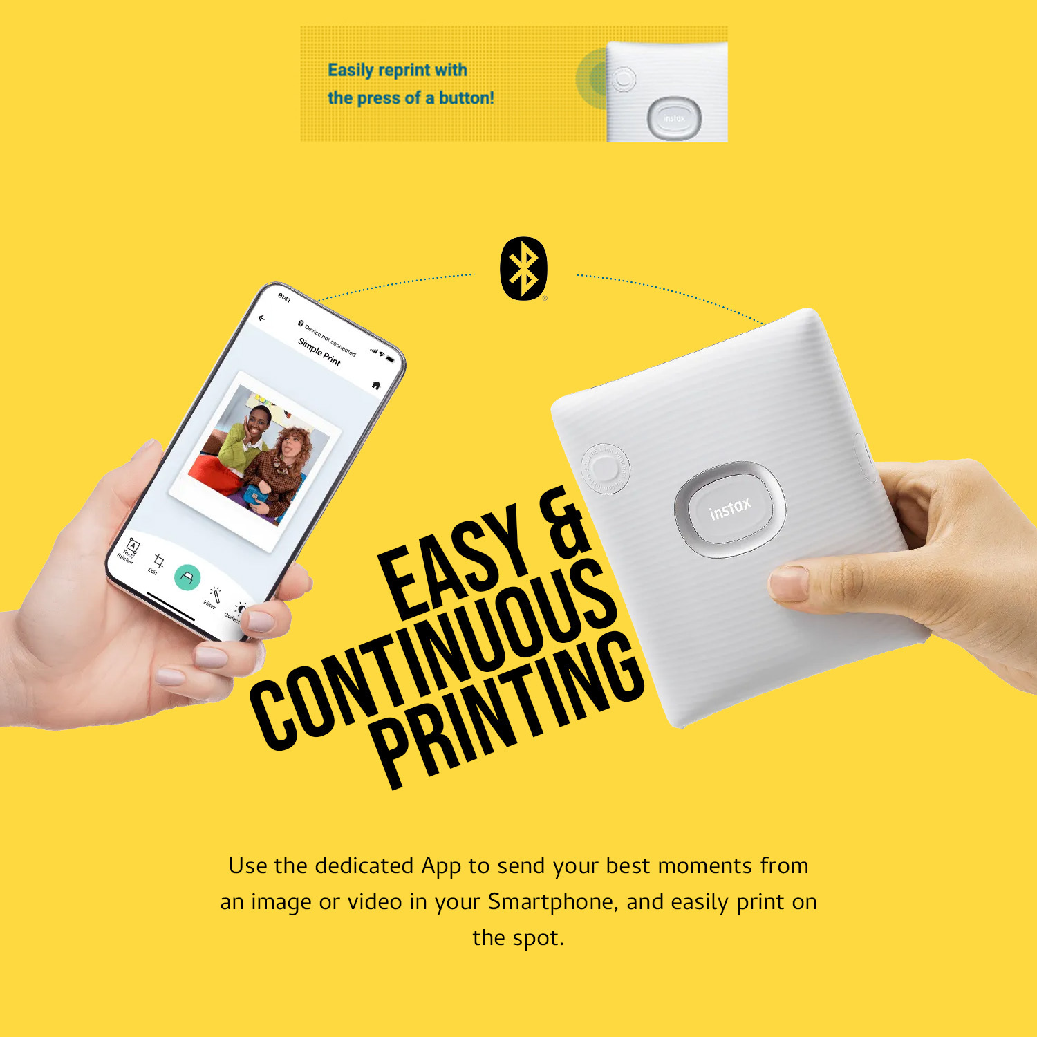 Teamed with the INSTAX SQUARE LINK App, you can take your best, action-packed Smartphone videos and turn them into INSTAX photos. You can even add fun, decorative frames, enhance memorable moments with various print mode options, crop, alter contrasts and apply filters. All before connecting wirelessly via Bluetooth to the INSTAX SQUARE LINK Smartphone printer and swiping up to print.