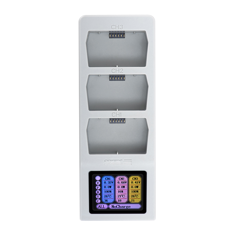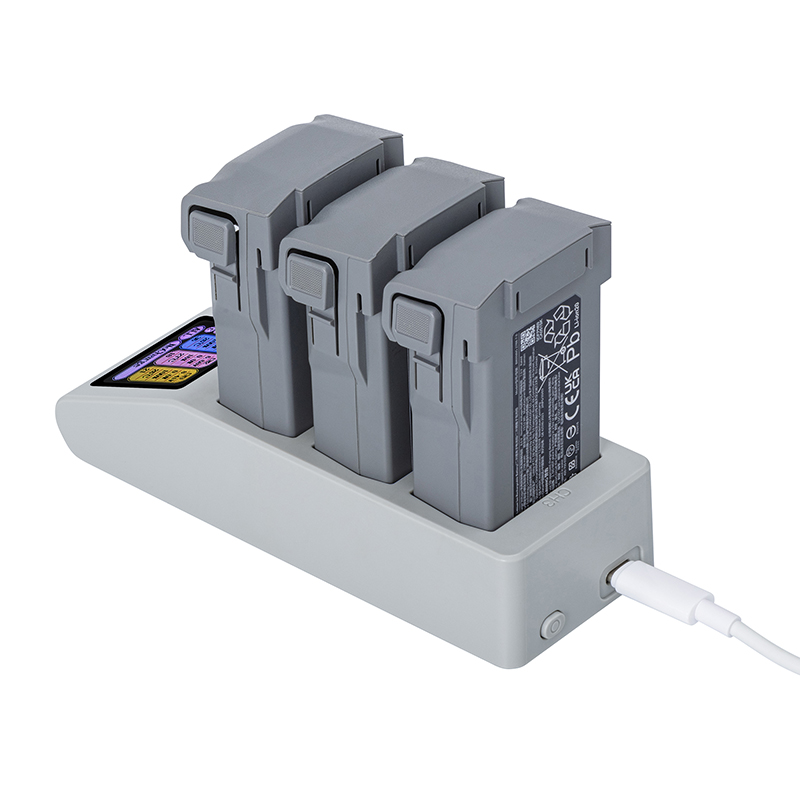 3. Designed with three battery slots, eliminating the hassle of repeatedly plugging and unplugging multiple batteries. This hub can charge three batteries sequentially at once. It automatically detects and prioritizes charging batteries with lower power levels, enabling quick replacement with fully charged batteries. A single 4680mAh battery takes approximately 45 minutes to fully charge (Long-endurance battery: 45 minutes; Short-endurance battery: 40 minutes).