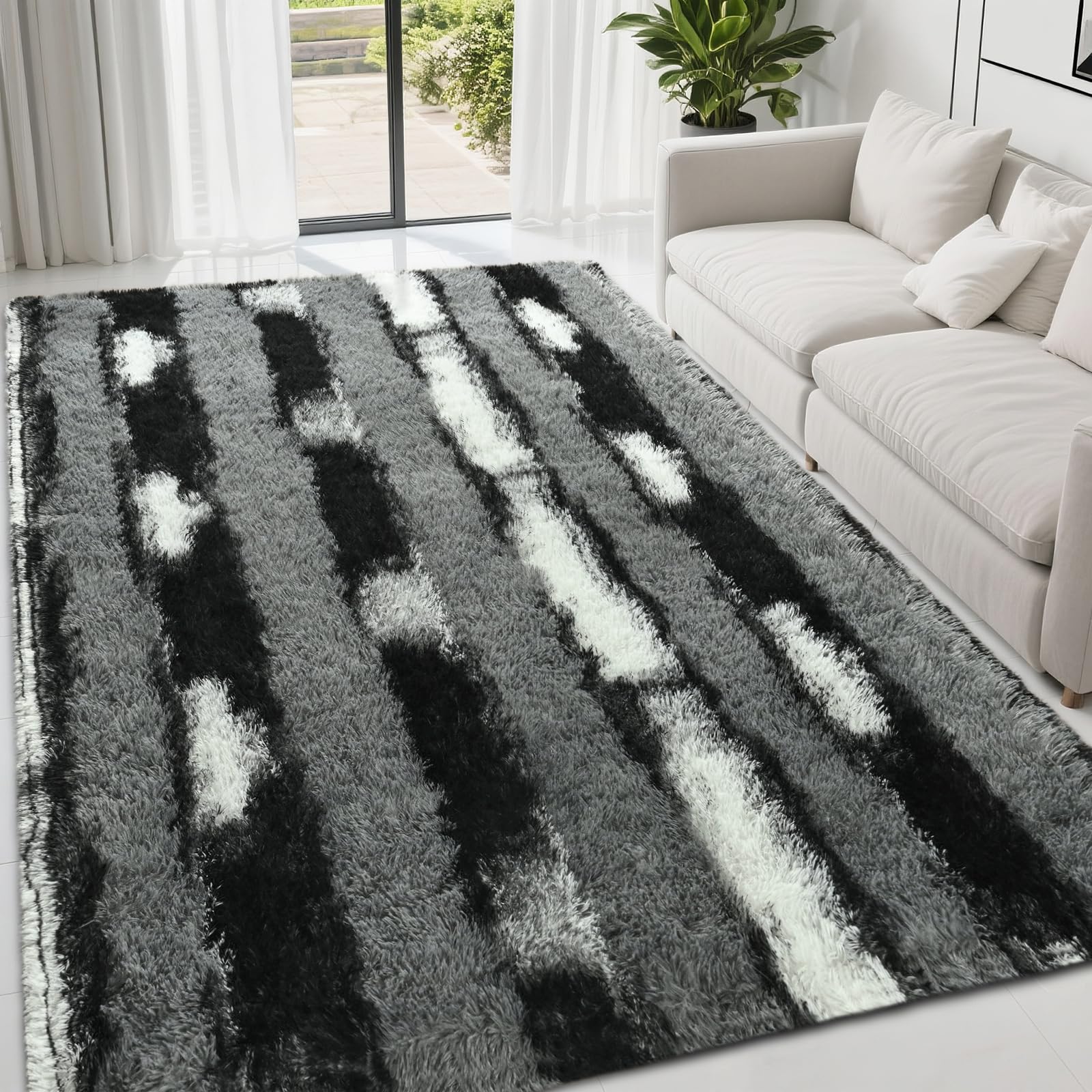 Striped Rug Construction Type:Striped design, Non-slip Bottom, Microfiber, Thickened Memory-Foam Special Feature: Fluffy, Thickened, Non Slip, Durable Style:Modern Aesthetic Minimalist Carpet Color: Grey and White, Black and White, Blue and White, Pink and White, Green and White, Beige and White, Applicable Room Type:living room rug, bedroom rug, bedside rug, nursery rug, classroom rug, kids room rug, playroom rug, dining room rug, office rug, nursery rug, apartment rug, university dormitory rug, study room rug Size selection suggestions: The 4’×6’ area rug is suitable for your bedside or nursery, or kids room The 5’×7’ area rug is suitable for your playroom or bedroom The 6’×9’ area rug is suitable for your living room or big dining room Warm tips for the rug: 1. Our fluffy carpets are vacuum packaged, the carpet may appear a bit thin at first,Don't worry, it will return to a fluffy state after 2-3 days. You can also use a hair dryer to fluff the carpet up faster. 2. When opening the packaging, the carpet may emit some odor, which is a normal phenomenon caused by warehouse storage. Please leave it in a well ventilated place for 1-2 days, and the odor will dissipate. 3. Daily cleaning is recommended to use vacuum cleaner for care to keep the bedroom carpet comfortable.