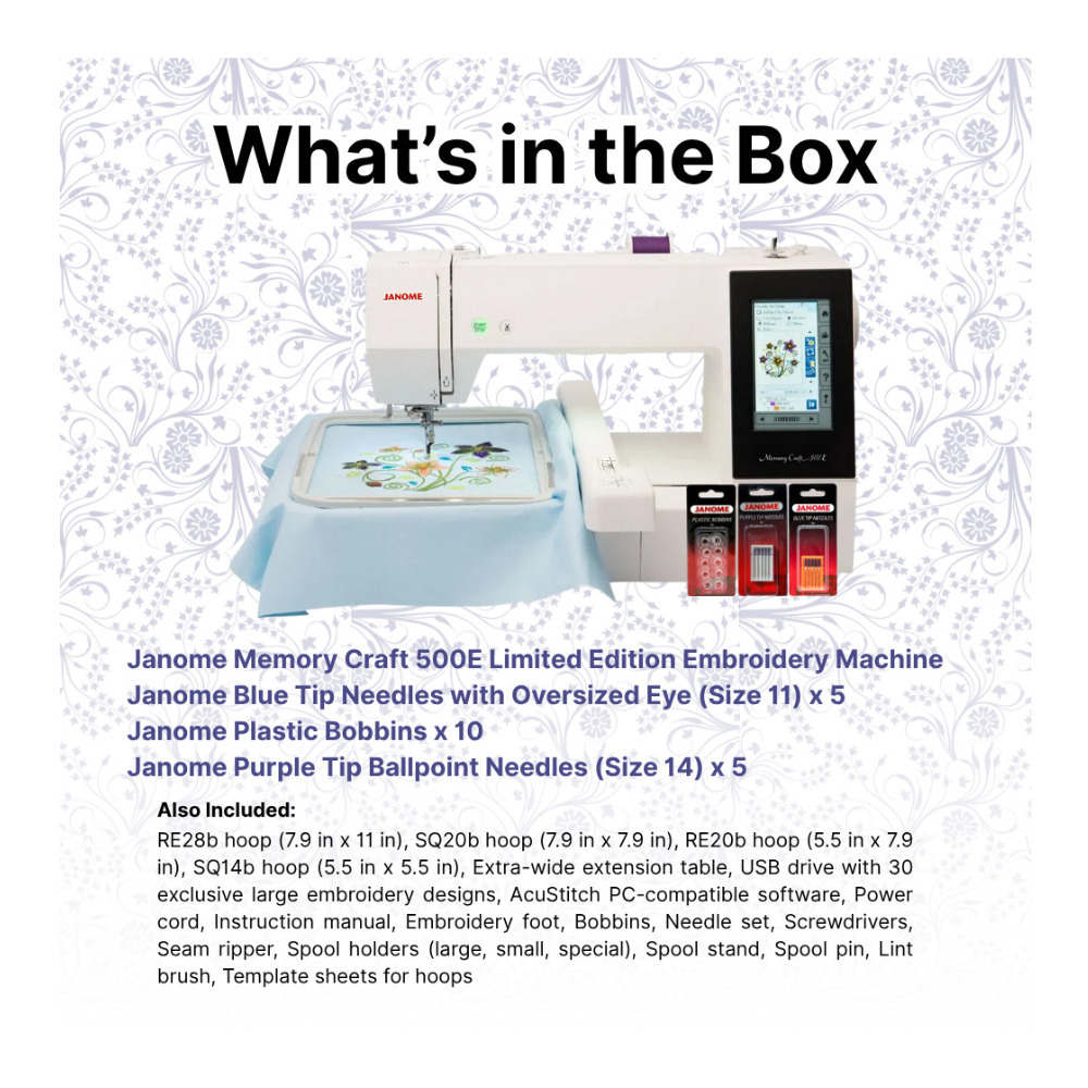 Discover unlimited creative possibilities with the Janome Memory Craft 500E Limited Edition embroidery machine. Designed for hobbyists and professionals alike, this feature-rich model offers a maximum embroidery area of 7.9 in x 11 in, perfect for customizing garments, home décor, and accessories. It includes 160 built-in designs, 6 fonts for monogramming, and supports 2- and 3-letter monograms. The machine comes with 4 embroidery hoops (RE28b 7.9 in x 11 in, SQ20b 7.9 in x 7.9 in, RE20b 5.5 in x 7.9 in, and SQ14b 5.5 in x 5.5 in) and an extra-wide extension table for added workspace.