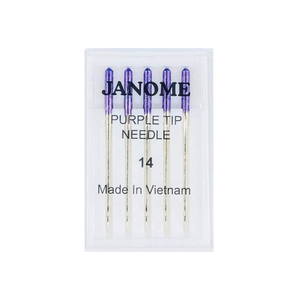 Discover the ultimate solution for smooth, skip-free stitching with the Janome Purple Tip Needle. Designed specifically for challenging projects like free-motion quilting, dense embroidery, and stretch fabrics, this Size 14 needle features a cobra head flanged tip and ballpoint design to reduce resistance, eliminate skipped stitches, and enhance stitch quality. Whether you're working on knits, layered quilts, or hemming thick seams, this needle delivers the precision and reliability that sewists demand.