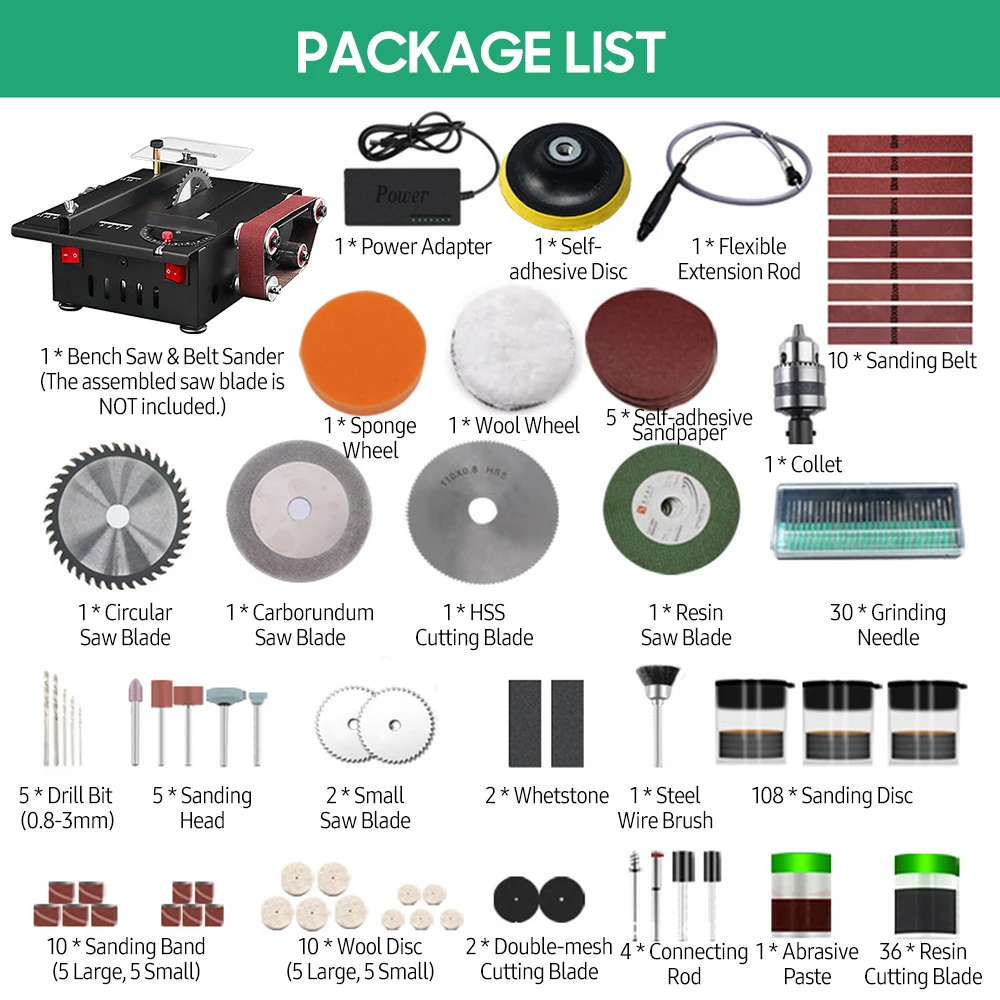 2 in 1 function of bench saw and belt sander. Type 1 is equipped with a circular saw blade and 10 sanding belts; type 2 is equipped with luxury accessories for sawing, cutting, sanding, grinding, carving, and drilling.