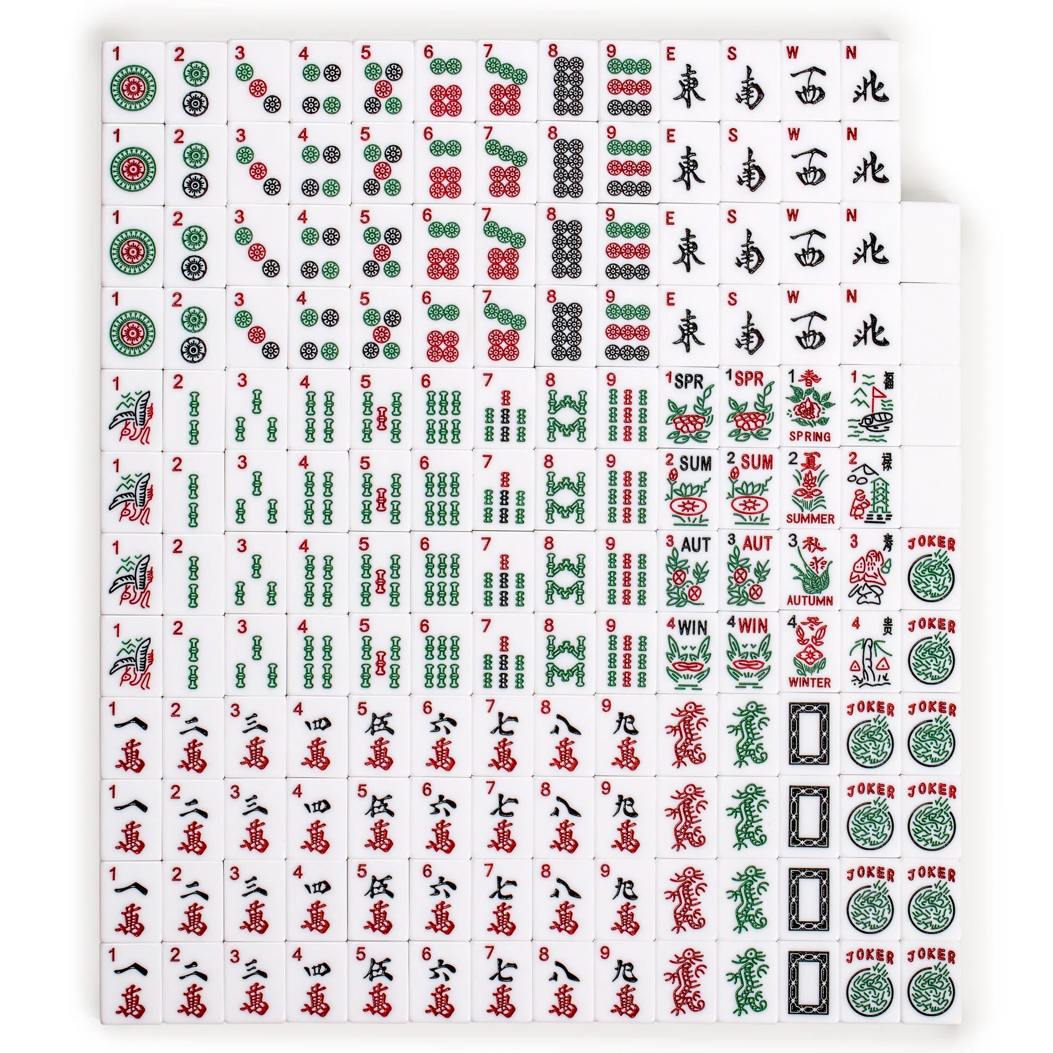 166 Scratch-Resistant Acrylic Tiles: 36 Circles, 36 Bamboo, 36 Characters, 12 Dragons, 16 Winds, 16 Flowers, 10 Jokers, and 4 Blank Spares. Each tile is engraved for easy readability with traditional Chinese characters, Roman (Western) letters, and Arabic numerals. Tile size: 1.2 x 0.9 x 0.5" (30 x 23 x 13mm).