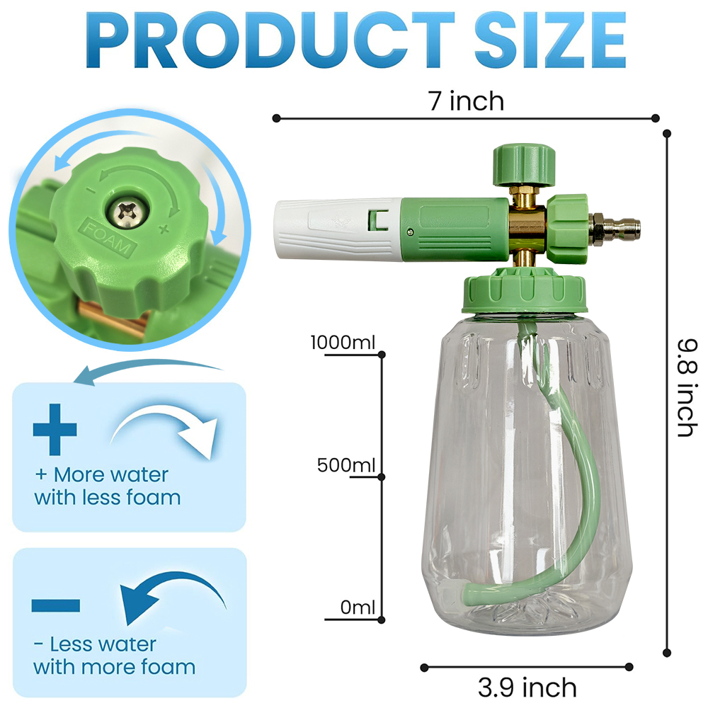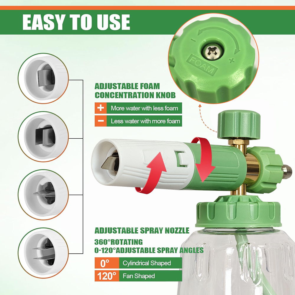 Adjustable Nozzle for Thick foam and Spray pattern: To achieve the thickest foam mixture, simply turn the top knob in a right (-) direction. This knob controls both the amount of water used and the overall thickness of the foam. Due to the foam gun's design, you'll be able to produce a thick, high-quality foam that is perfect for washing your car or other vehicles.