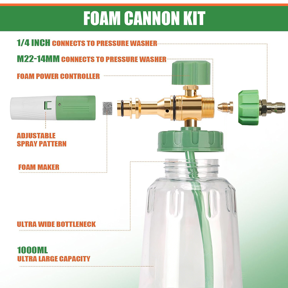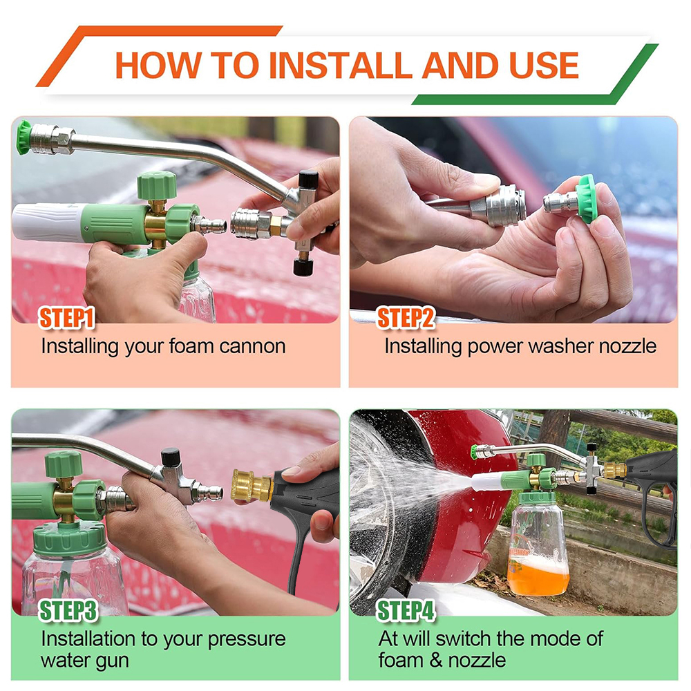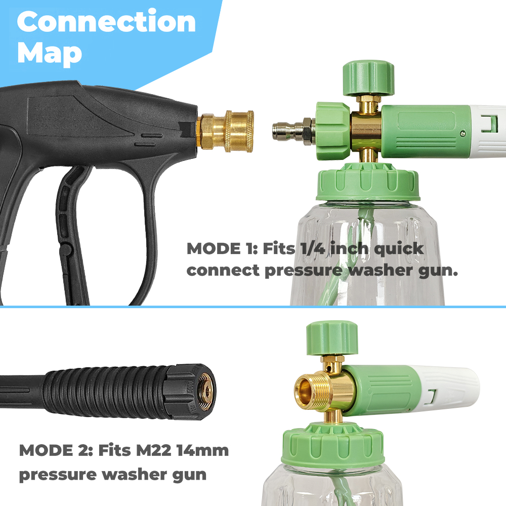 Universal Compatibility: Designed for wide compatibility, this foam cannon kit offers two easy connection methods to suit your pressure washer gun. If your gun has a 1/4" quick socket, you can directly connect it to the foam cannon without any adapters. This flexible connection design ensures compatibility with most pressure washers on the market, saving you the trouble of purchasing additional adapters.