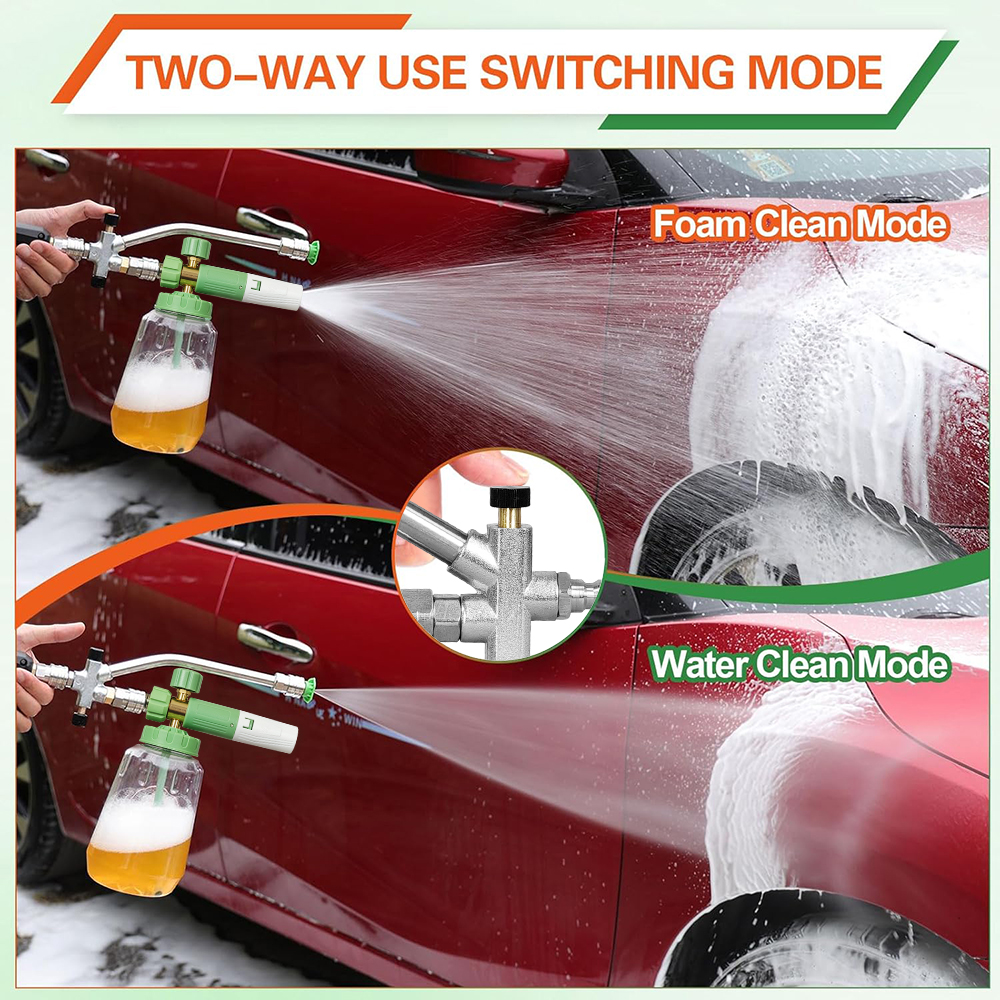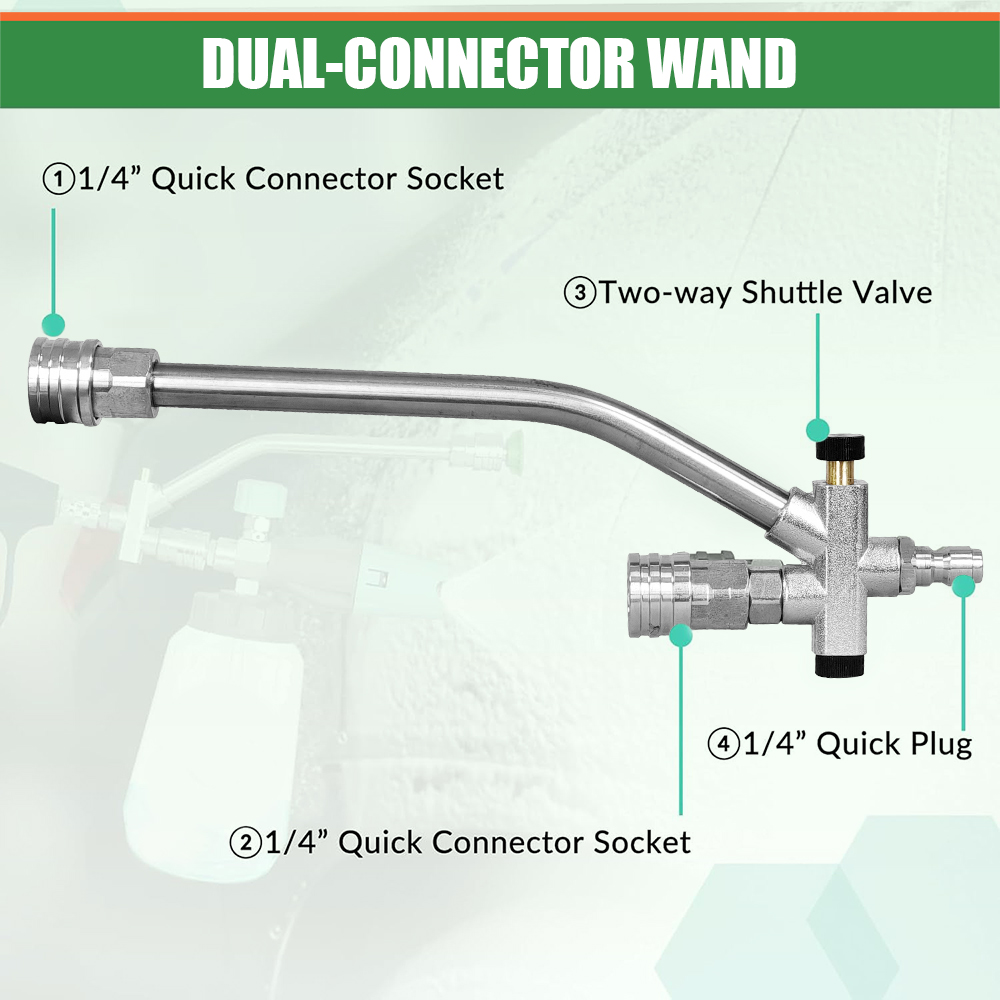Dual-Connector Design: Our pressure washer wand features a unique dual-lance design, allowing you to use the power washer nozzle and snow foam cannon simultaneously without frequent disassembly. Equipped with an integrated two-way shuttle valve, you can easily alternate between foam application and water cleaning with a simple operation. This versatile design streamlines your cleaning process, making it more efficient and effective for all your cleaning tasks, from gentle foam washing to powerful water rinsing.